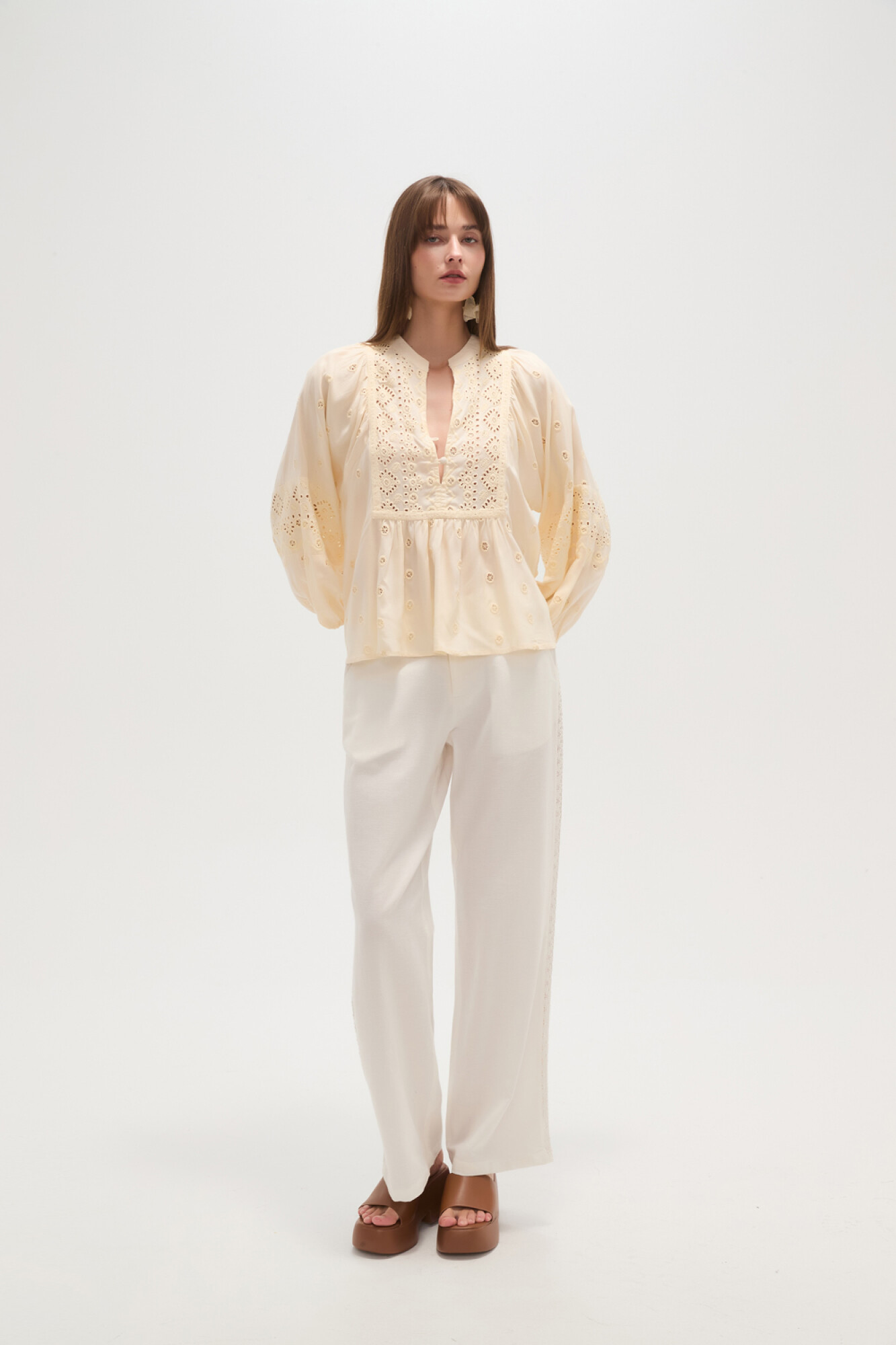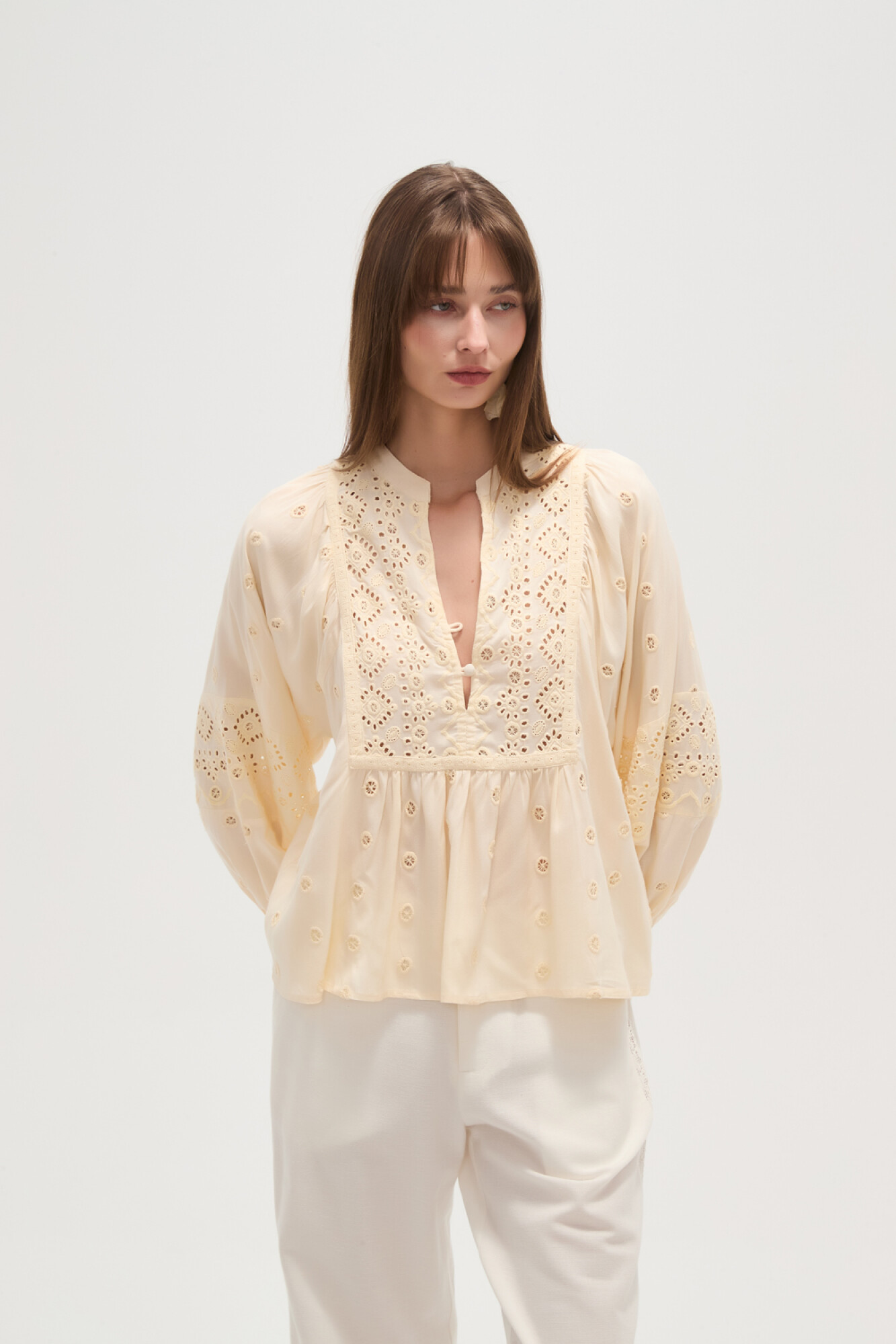 Nuevos Recibilo en Blusa viscosa, recurso bordado, broderie, holgado, con botones, con cinta y cuello en v