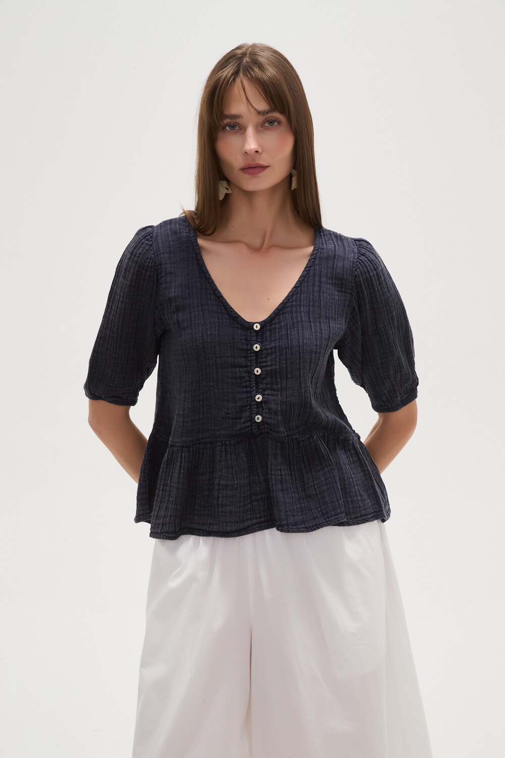 Sale Blusa algodon, volados, holgado, con botones y cuello en v