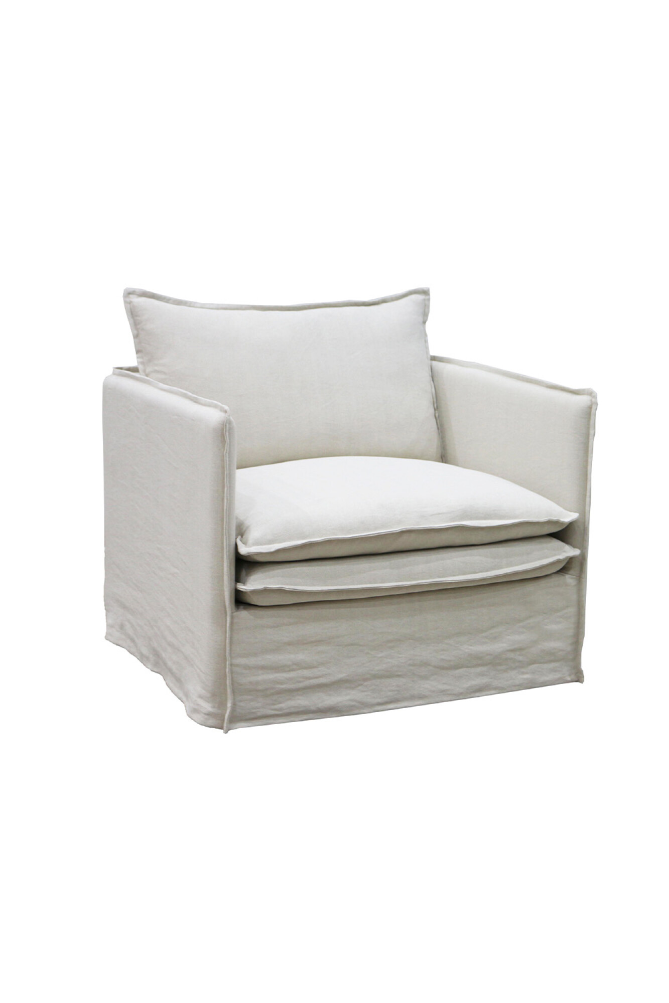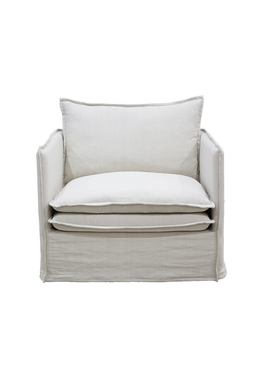 Sofá 1 cuerpo. Asiento y respaldo de plumas y espuma de alta densidad. Almohadones rellenos de pluma y espuma picada. Patas: Plástico Estructura: Madera de Alerce. Tela: 55% Algodón 45% Lino Color: Crudo/Natural Medidas: 86x100x94 cm 17341269103 https://www.indian.com.uy/catalogo/butaca-dana-crudo-natural_17341269_103
