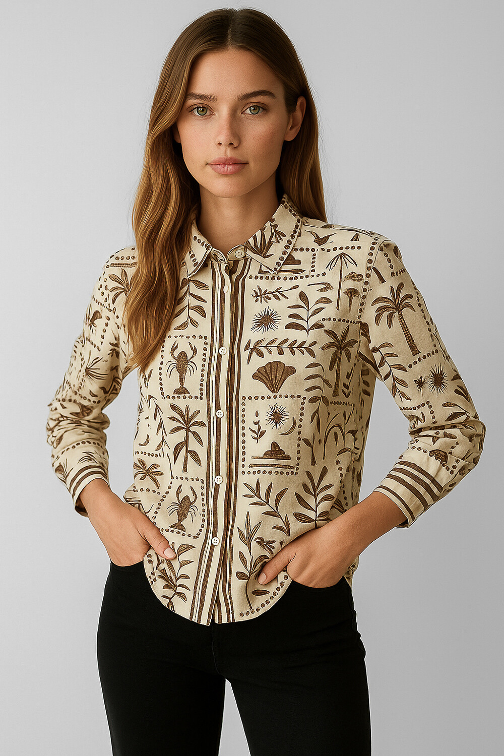 Nuevos Camisa lino, aop, estampado, holgado, con botones y cuello camisa