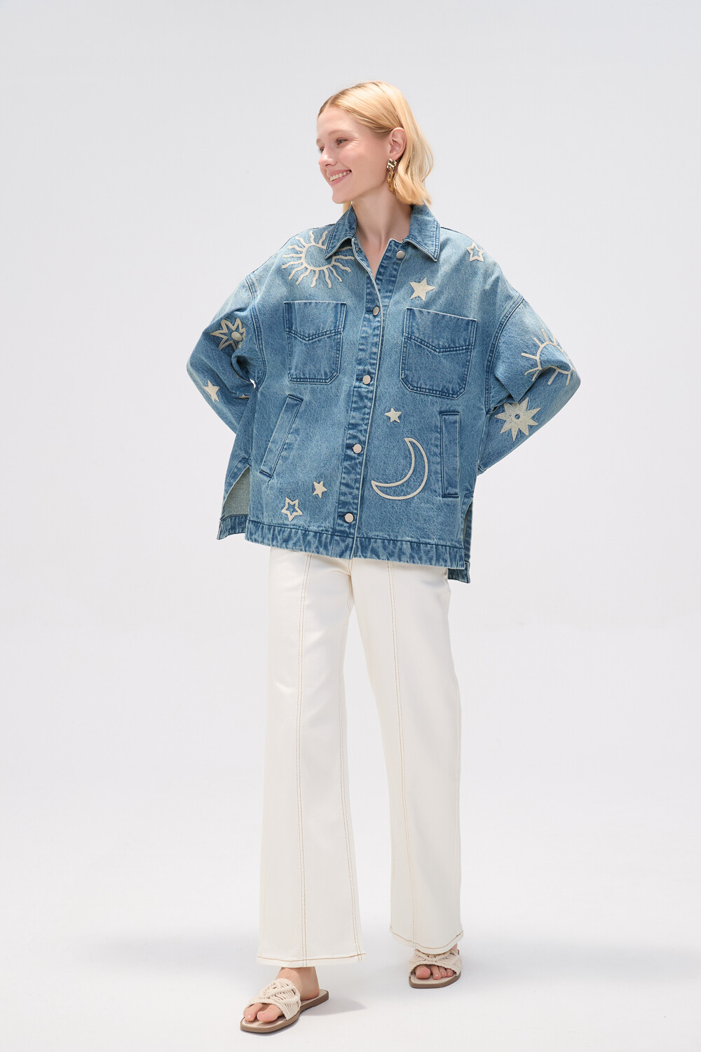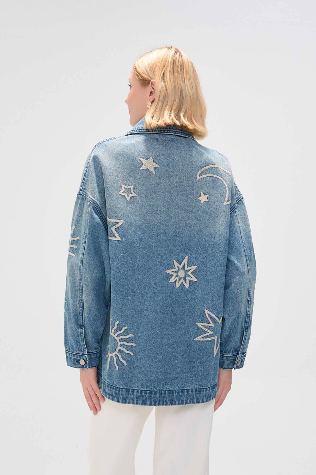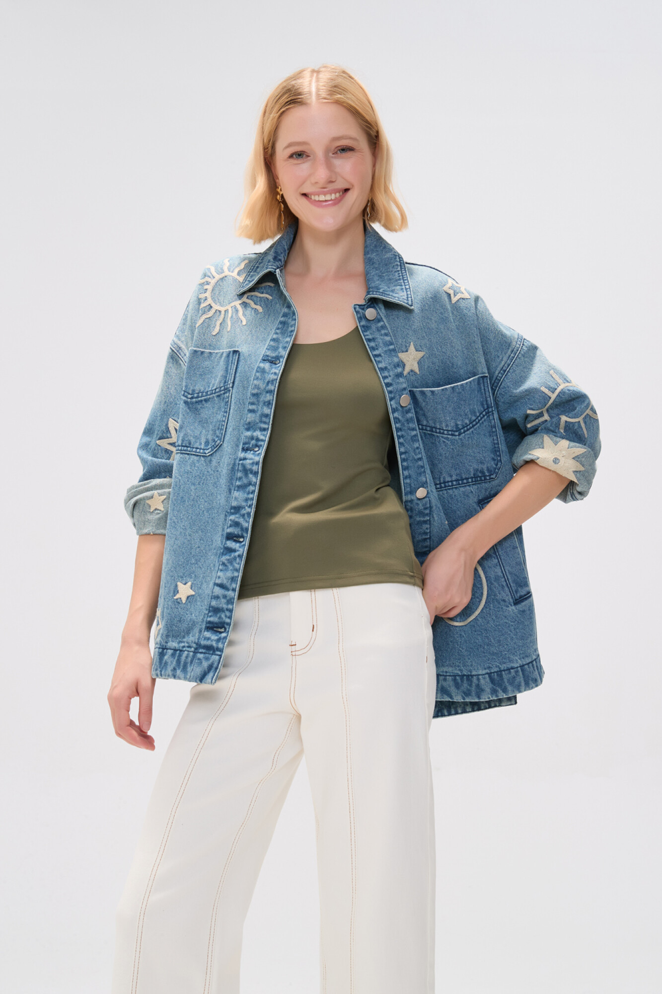Nuevos Campera manga larga de jean, bolsillos, bordado y tajo