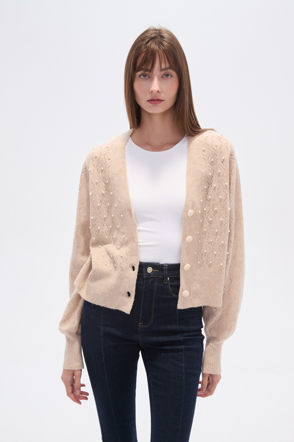 $ 839 Nuevos Cardigan poliester, al cuerpo, con cuentas y cuello en v