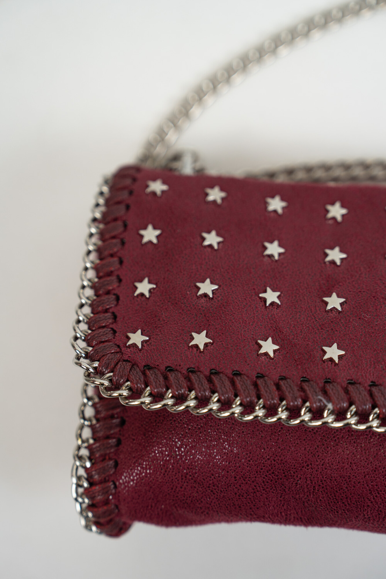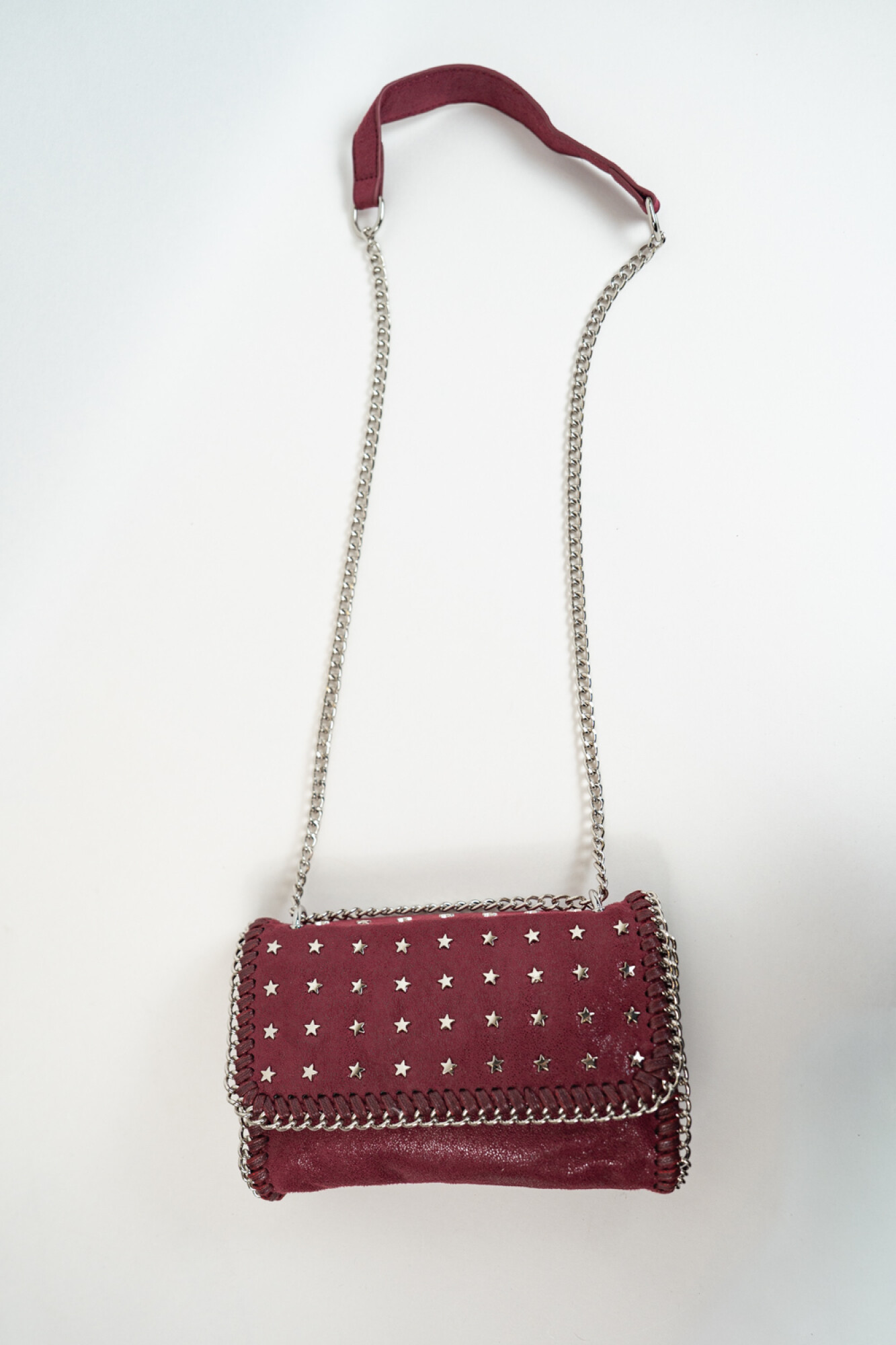 $ 1.019 Nuevos Recibilo en Cartera con tachas y correa de cadena. Medidas: 13x23cm. Color: Rojo oscuro
