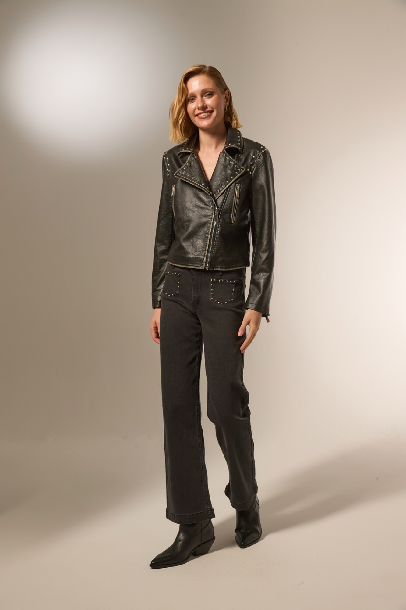Nuevos Recibilo en Chaqueta eco-cuero, bolsillos, holgado, con cierre, con tachas y cuello solapa
