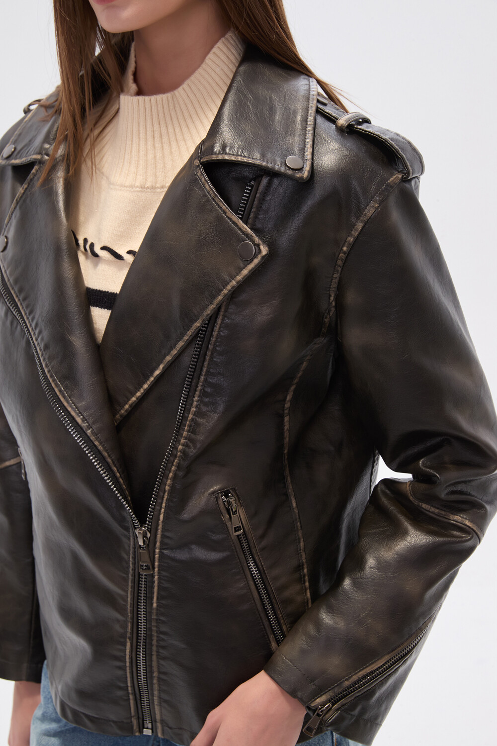 $ 2.175 Nuevos Chaqueta eco-cuero, wash, bolsillos, holgado, con cierre y cuello solapa