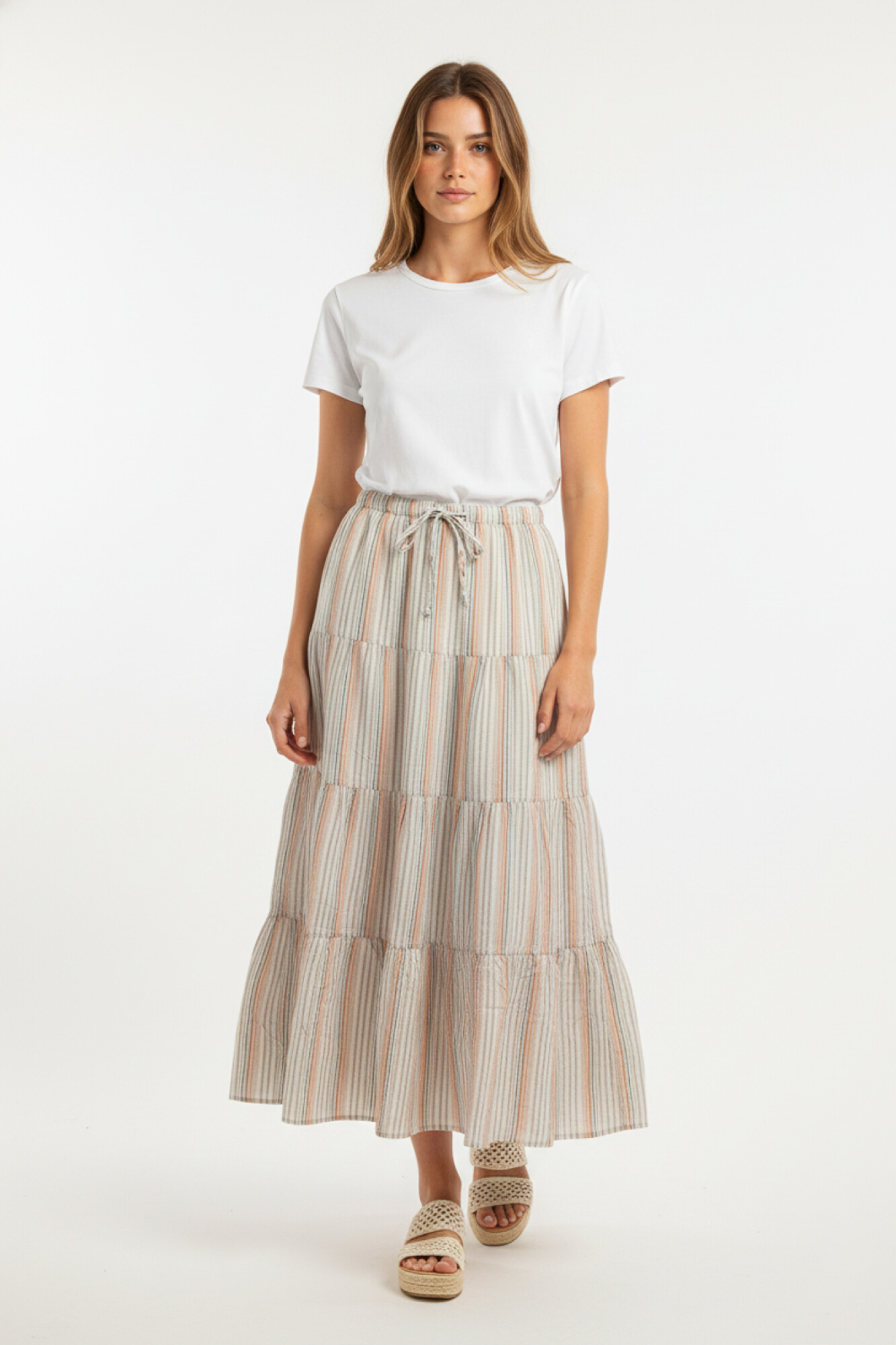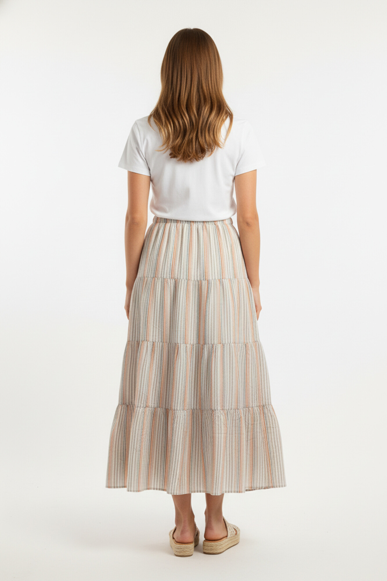 $ 839 Nuevos Recibilo en Falda largo de lino + viscosa, rayas y volados