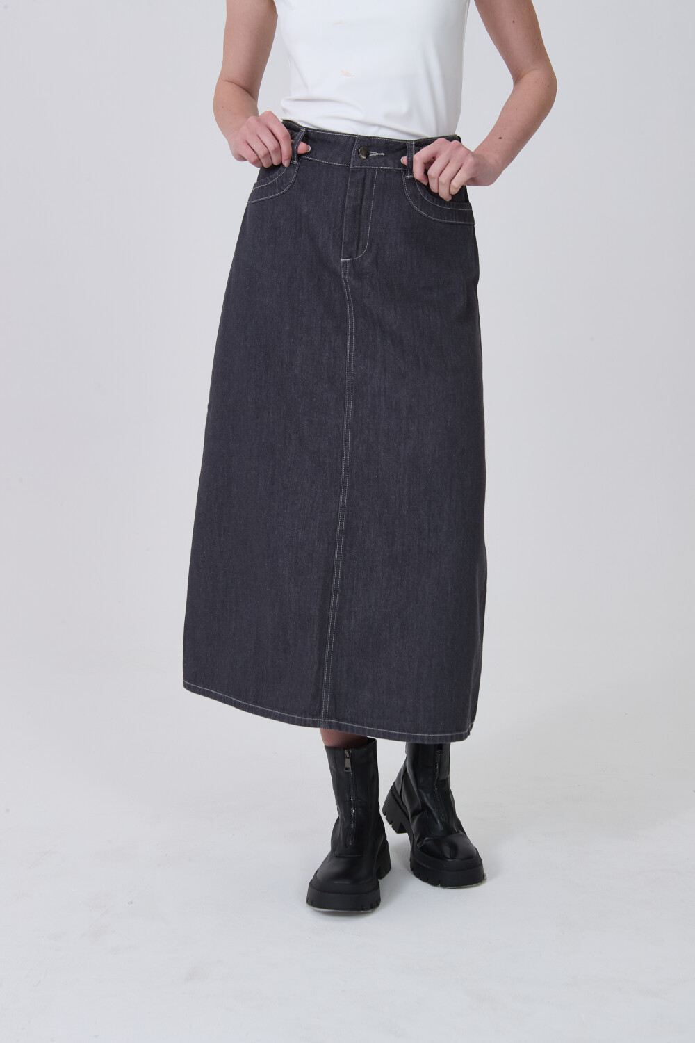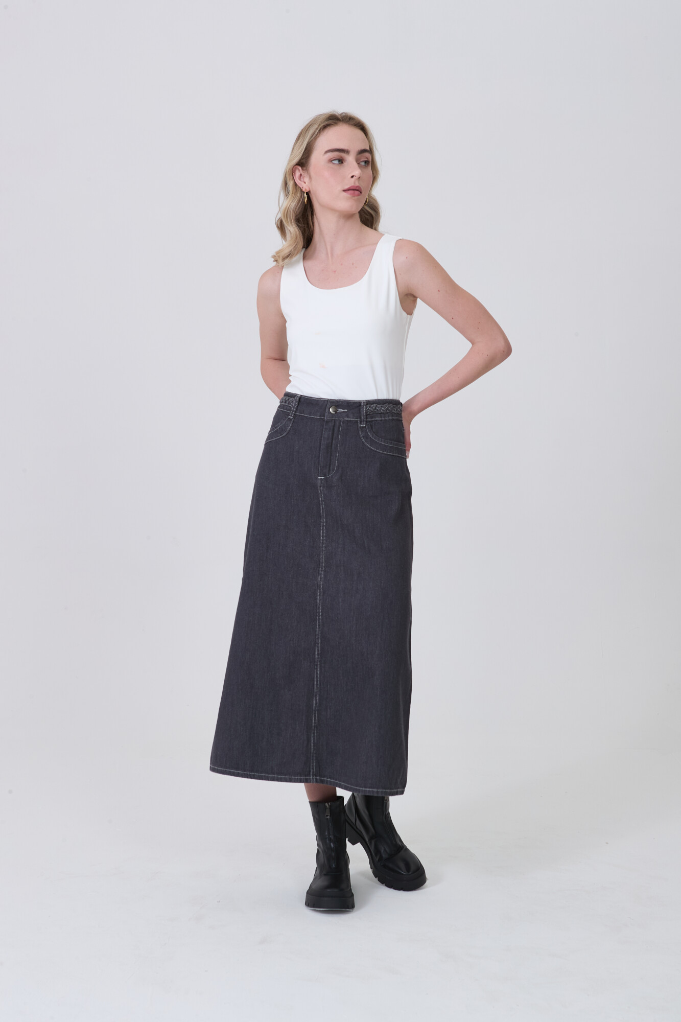 Nuevos Falda largo de jean, bolsillos y trenzado