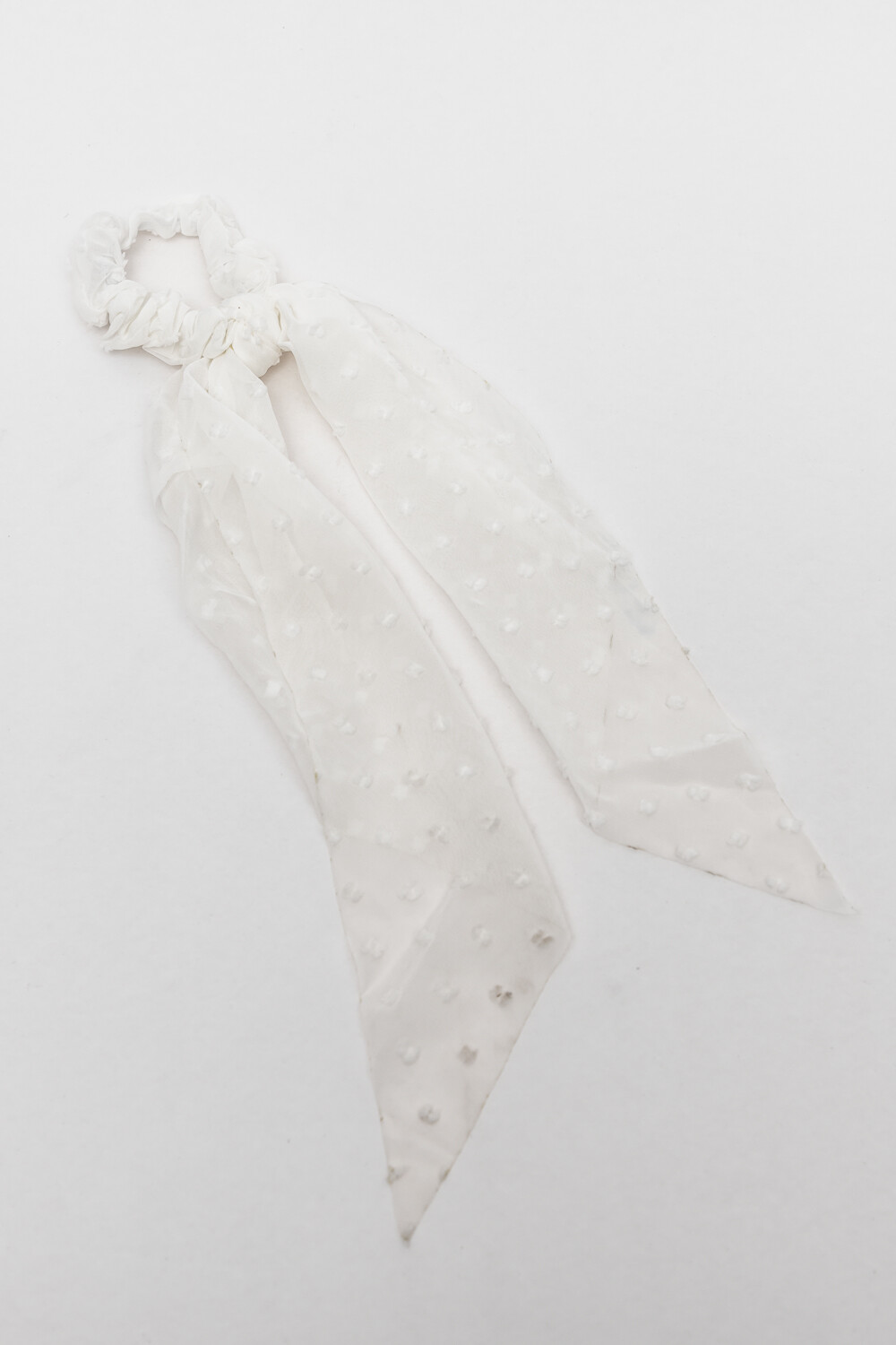 $ 128 Nuevos Recibilo en Gomita de pelo con cintas. Color: Blanco. Medidas 28cm