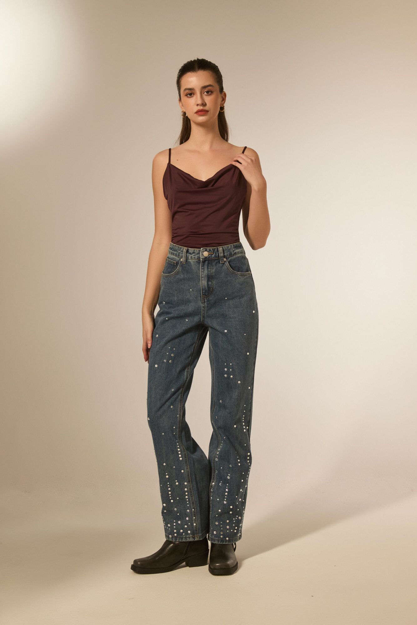 $ 1.223Pantalon jean, bolsillos, strass, recto y de calce alto
