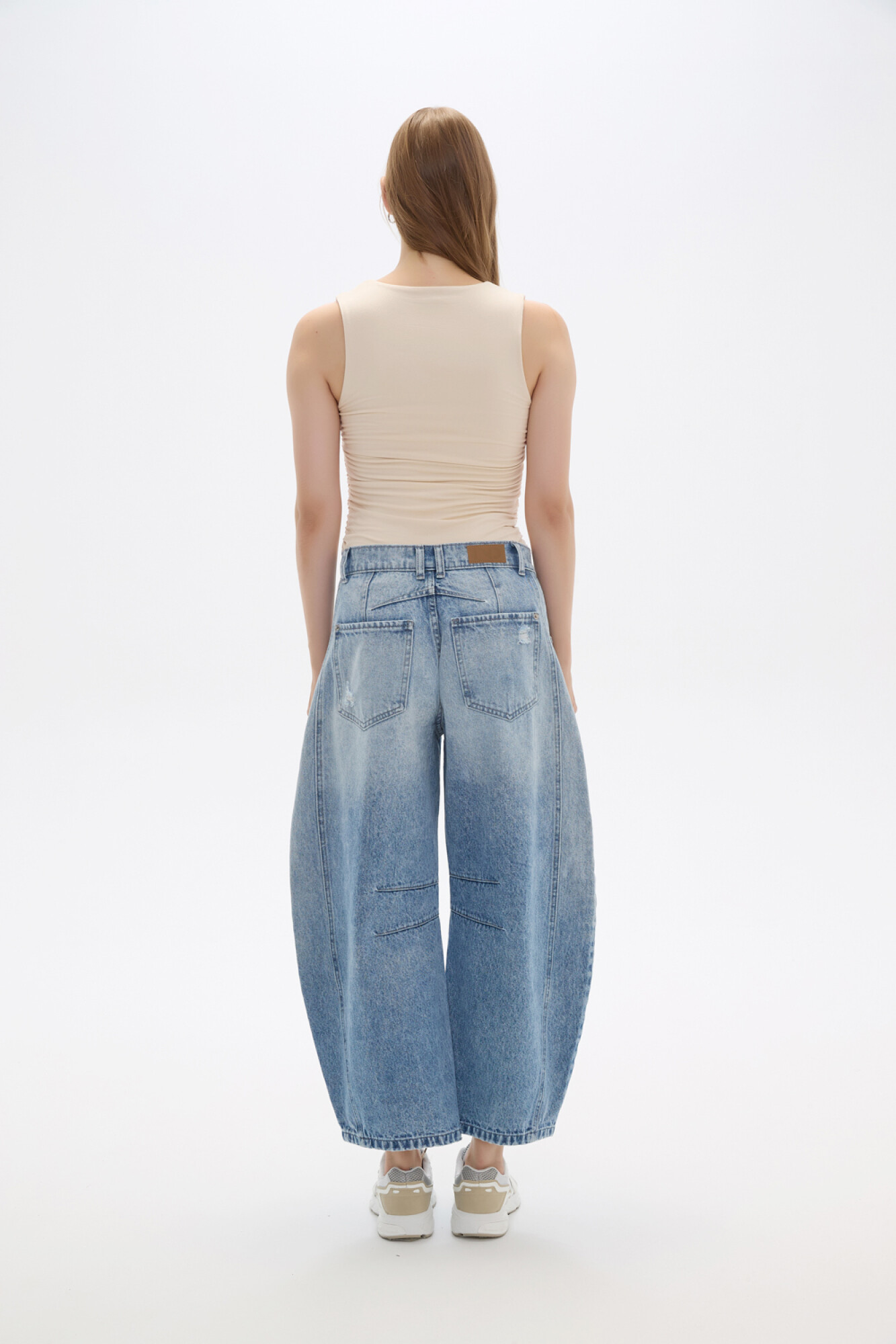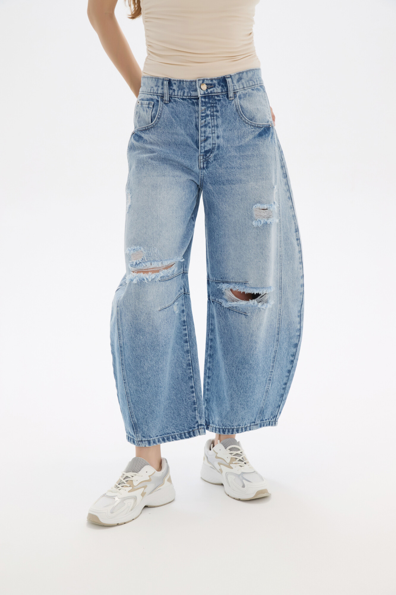 $ 1.079 Nuevos Pantalon jean, bolsillos, pinzas, roturas, barrel y de calce medio