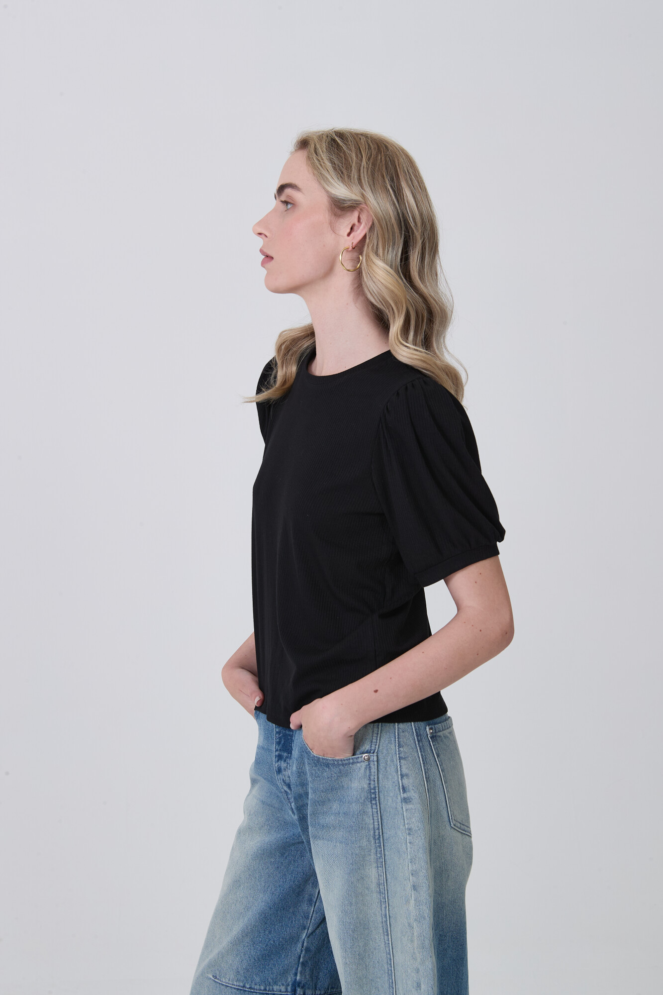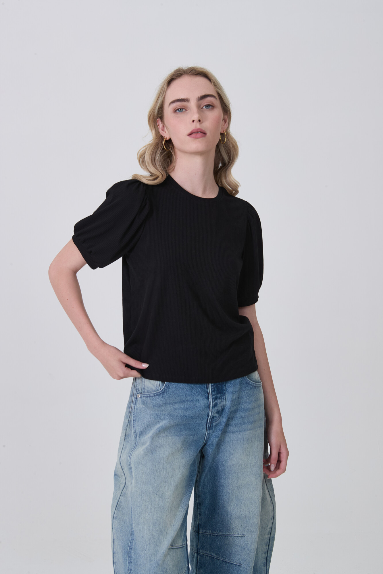 $ 479 Nuevos Remera manga abullonada de viscosa, frunces, al cuerpo y cuello redondo