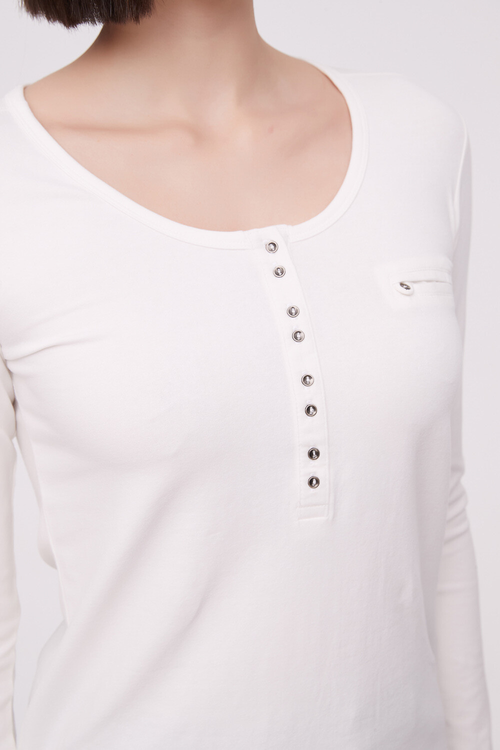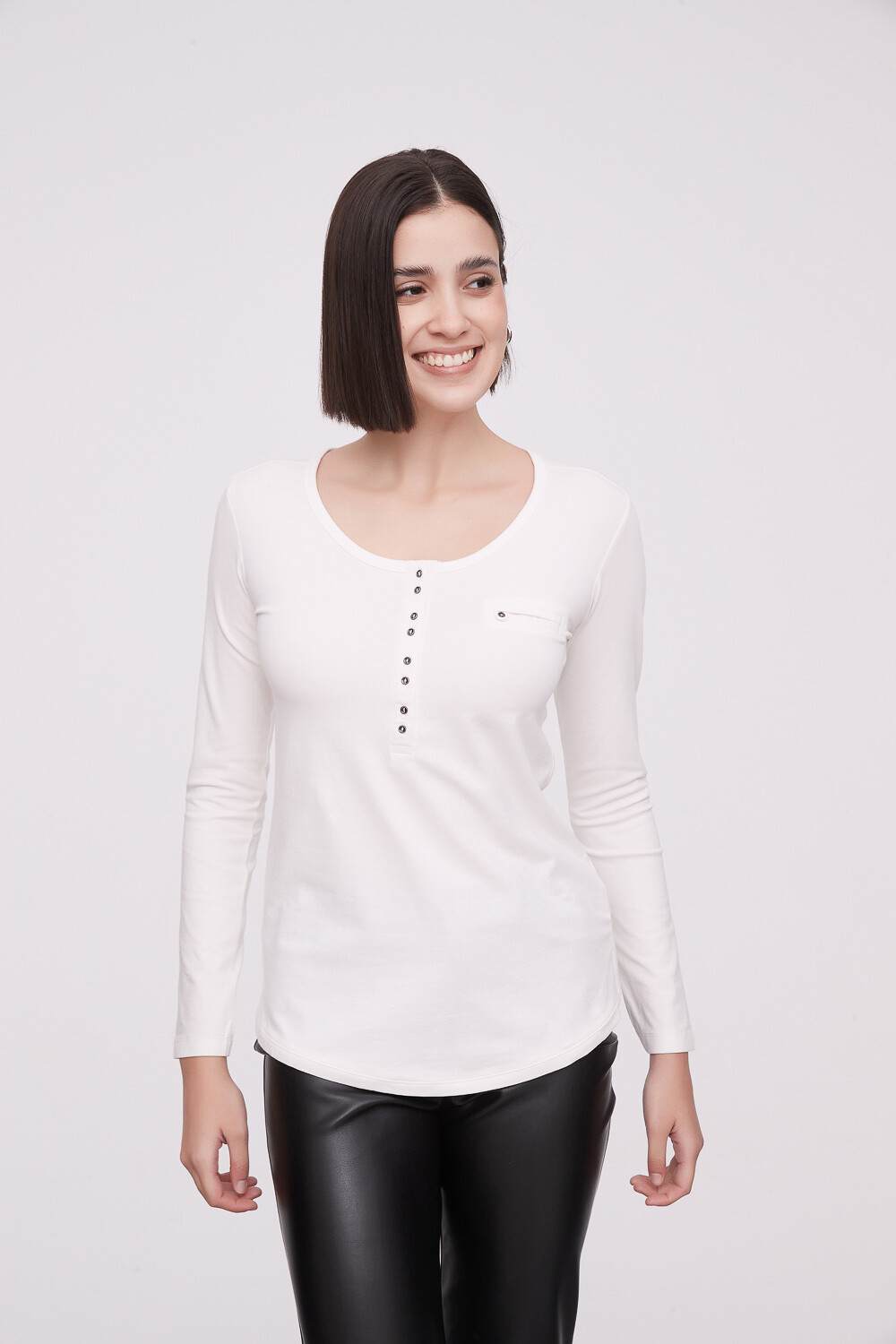 Nuevos Recibilo en Remera manga larga de algodon, liso, entallado, con botones y cuello redondo