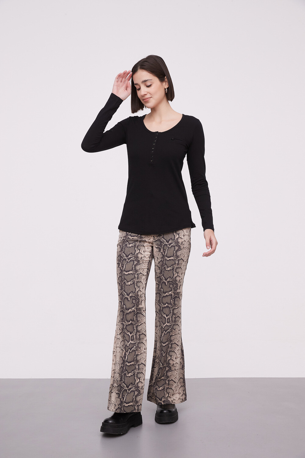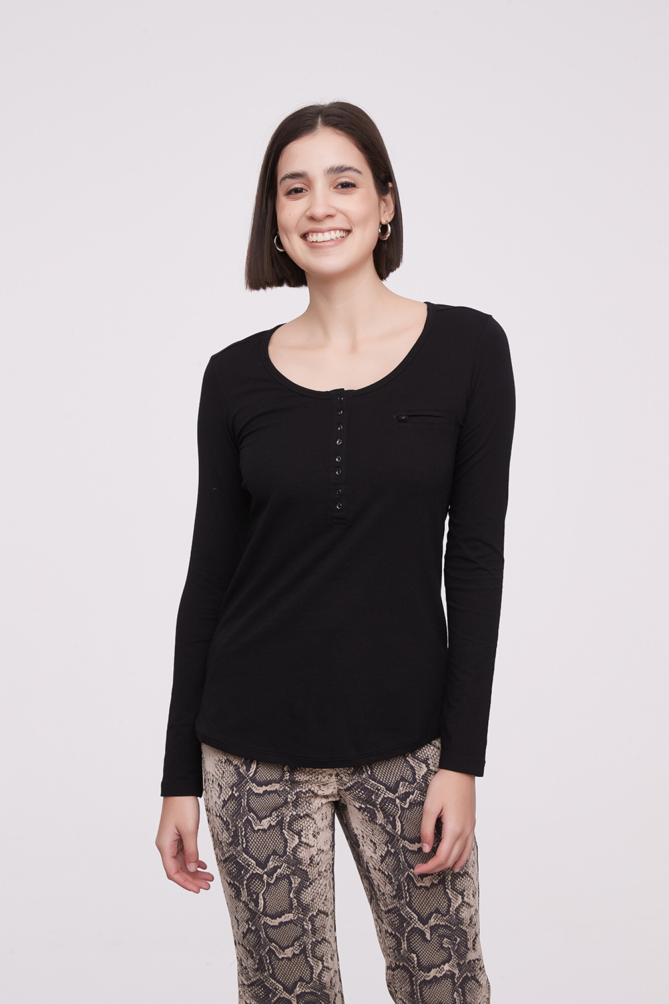 Nuevos Recibilo en Remera manga larga de algodon, liso, entallado, con botones y cuello redondo