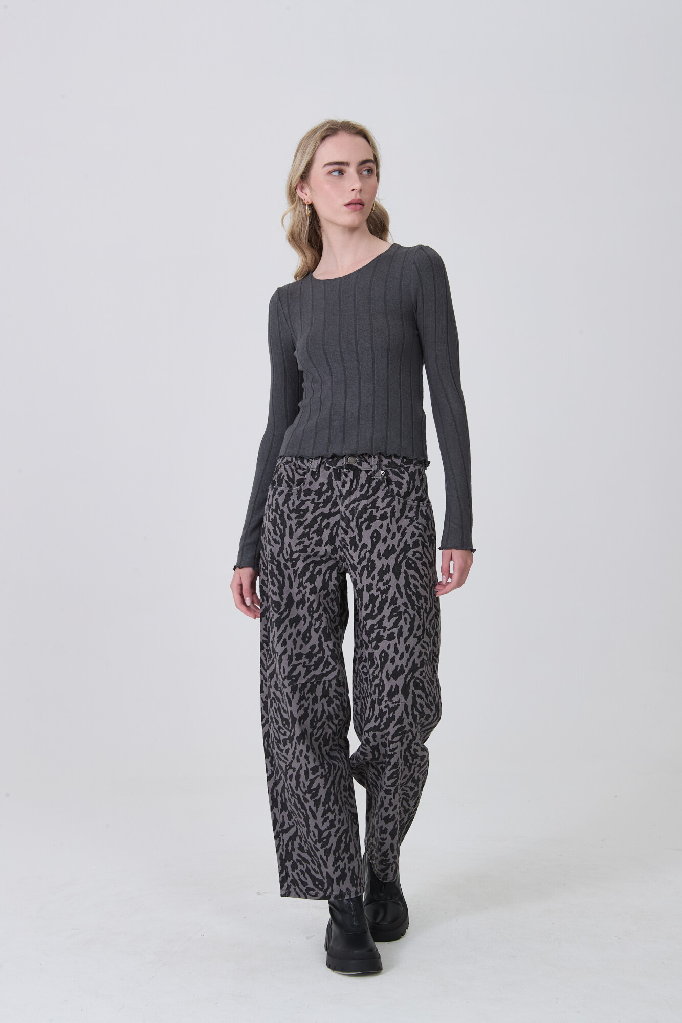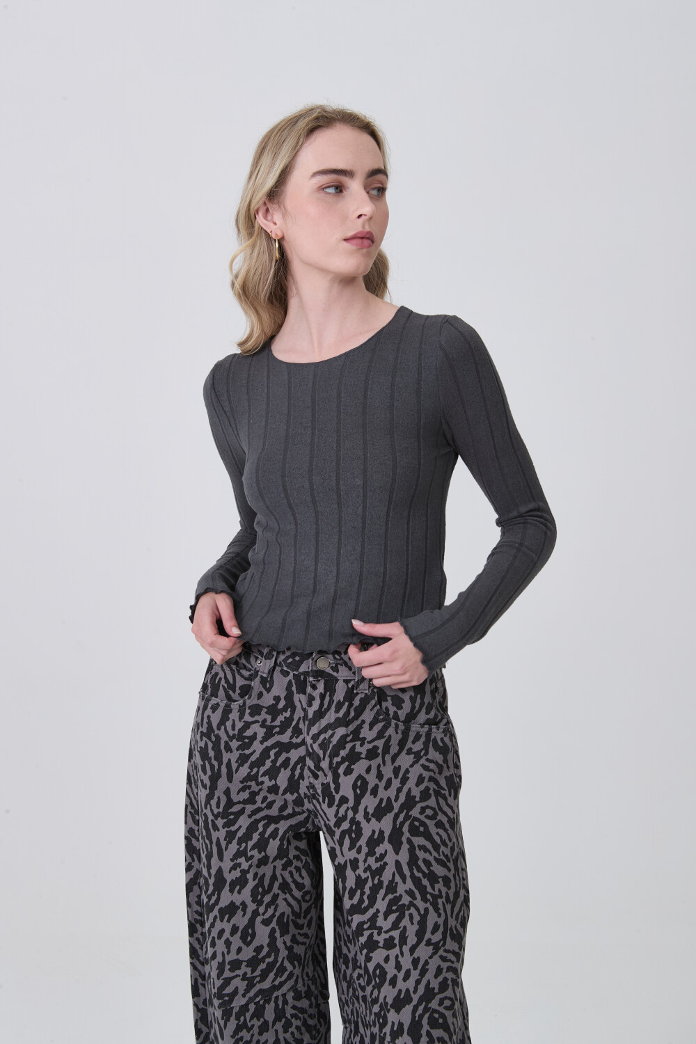 $ 407 Nuevos Remera manga larga de viscosa, entallado y cuello a la base