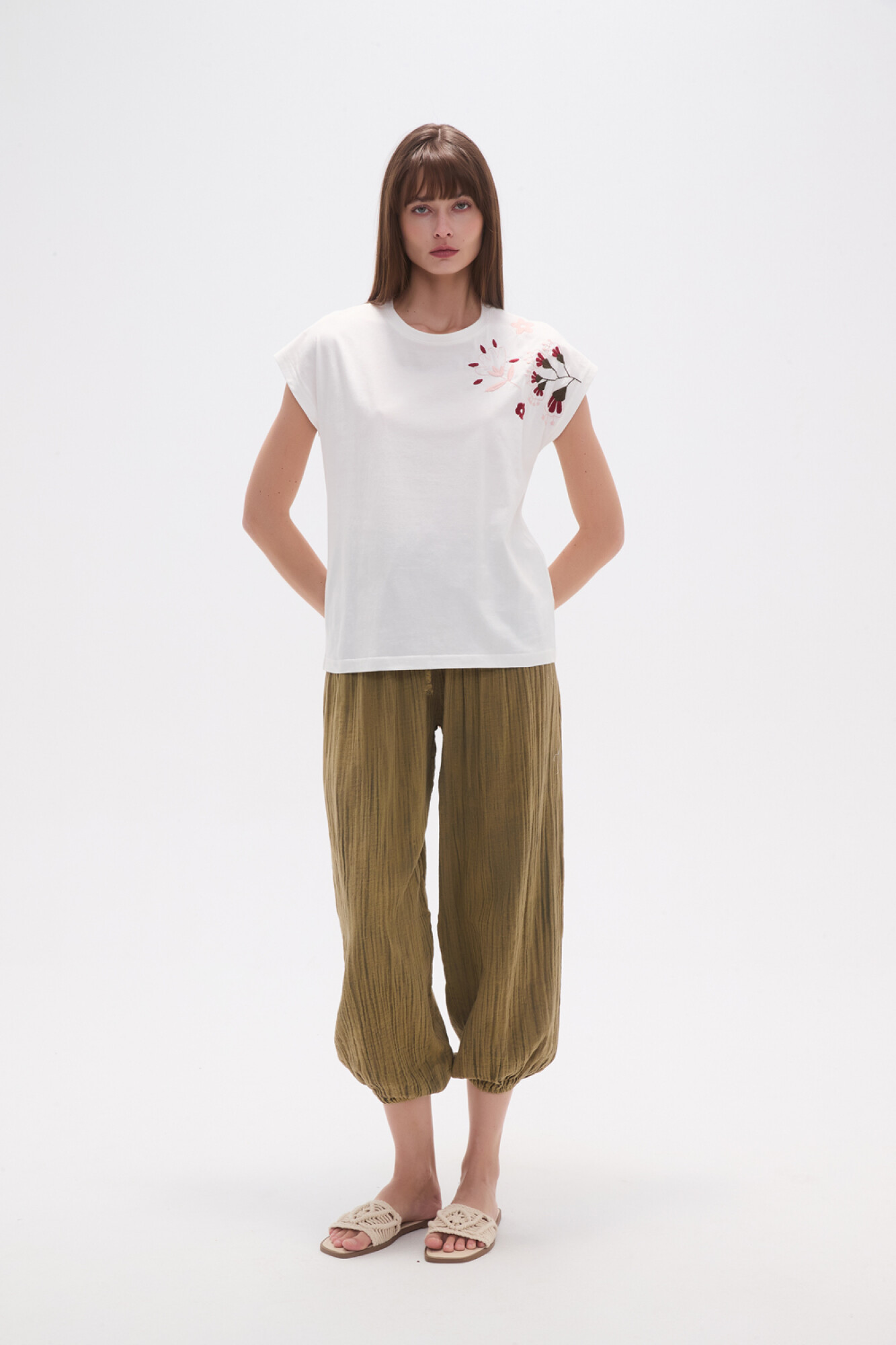 $ 407 Nuevos Recibilo en Remera manga corta de algodon, recurso bordado, bordado, holgado y cuello a la base