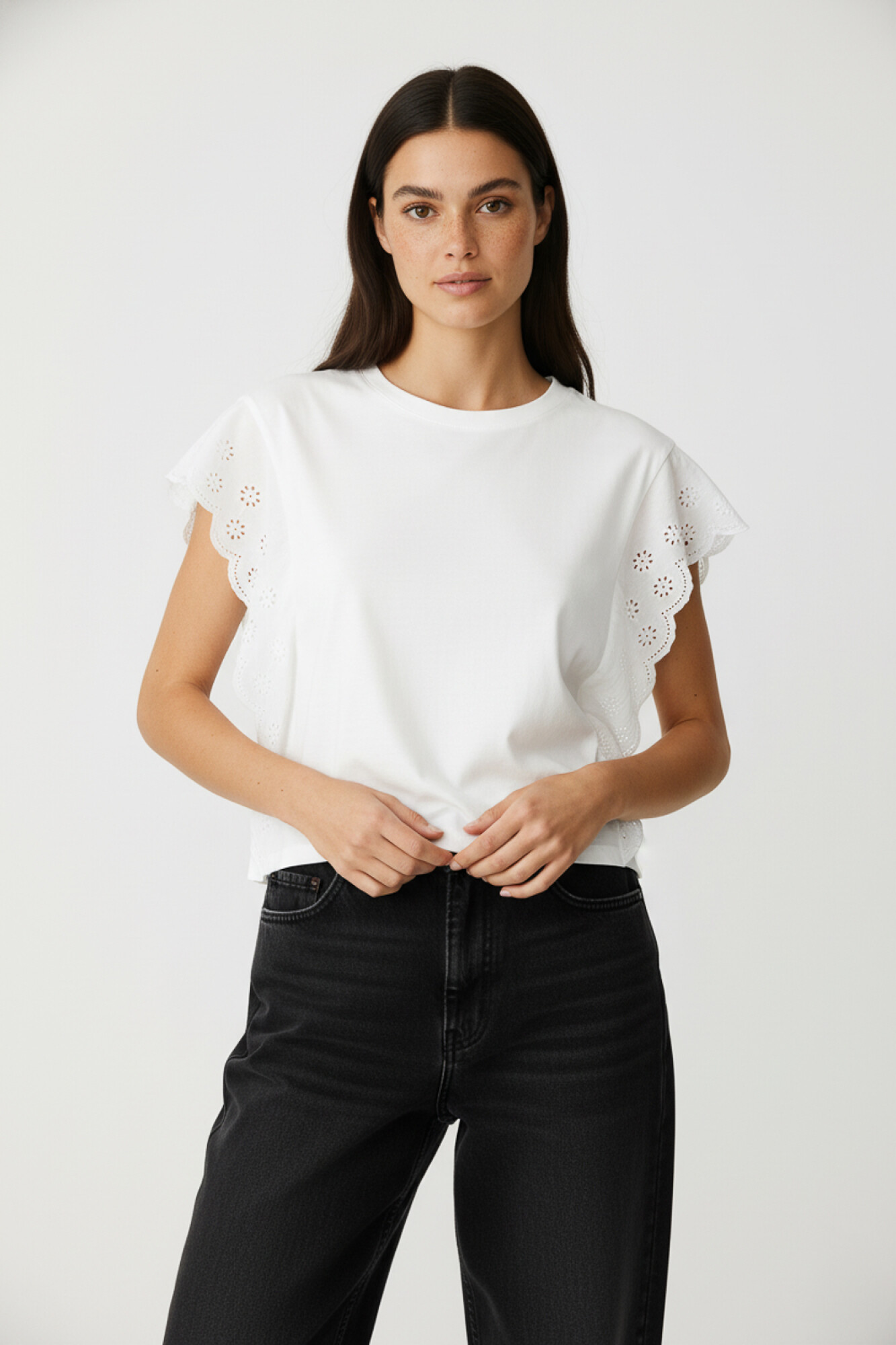 Nuevos Recibilo en Remera manga corta de algodon, broderie, holgado y cuello a la base