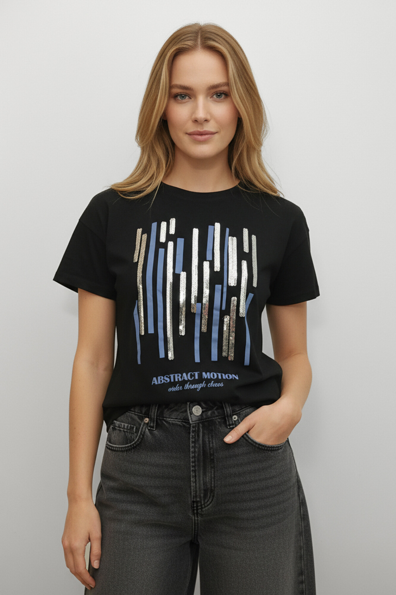 $ 407 Nuevos Remera manga corta de algodon, con lentejuelas y cuello a la base