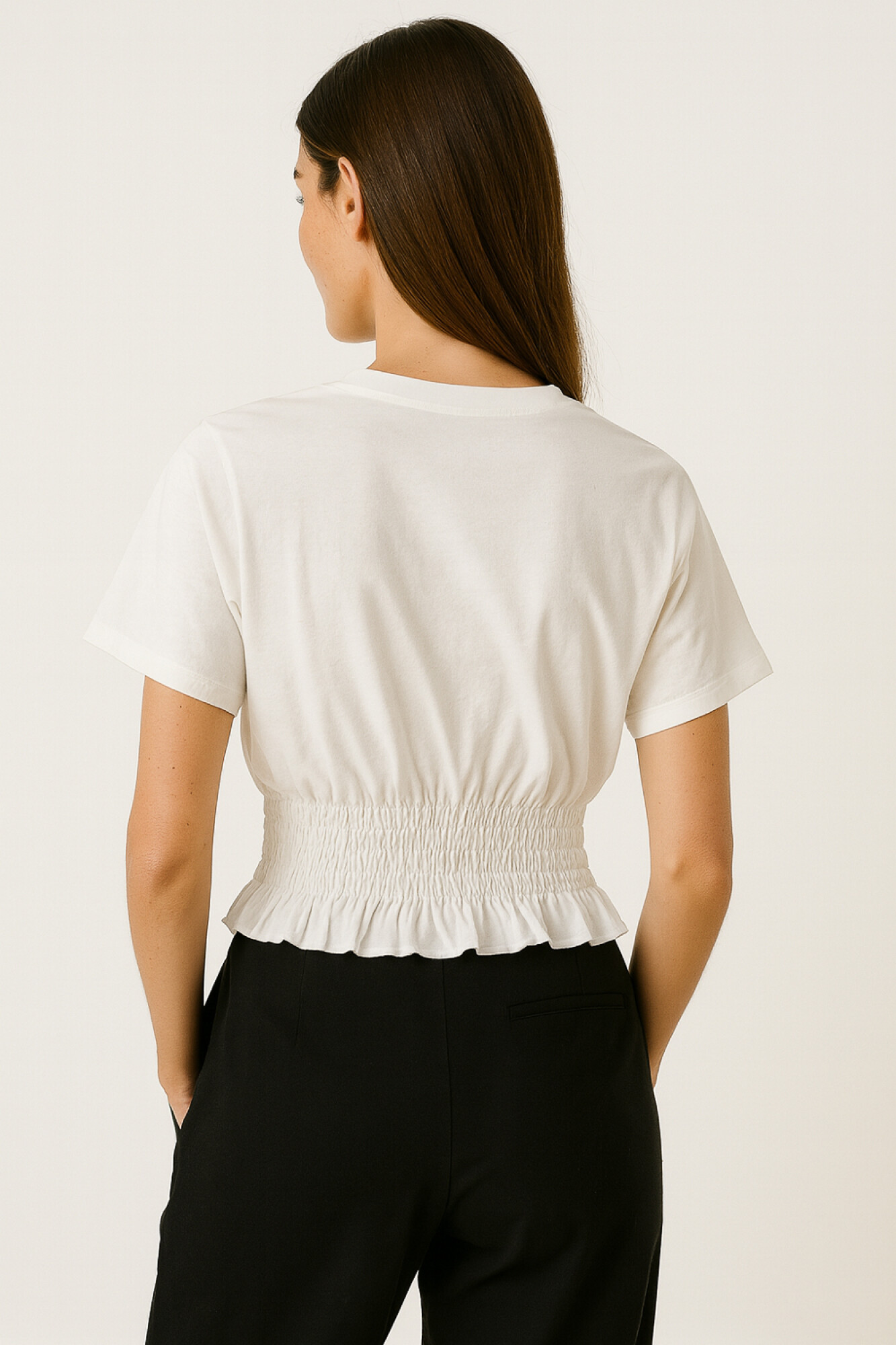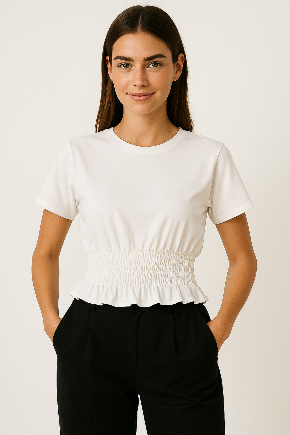 $ 407 Nuevos Remera cropped manga corta de algodon, punto smock, al cuerpo, con elastico y cuello a la base
