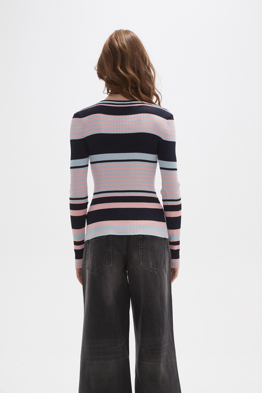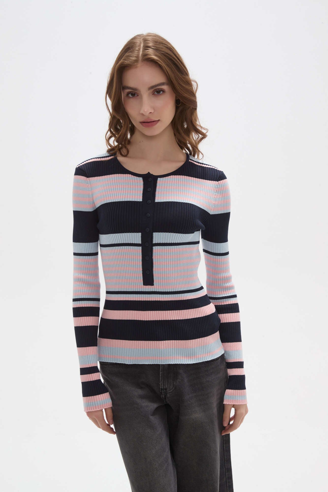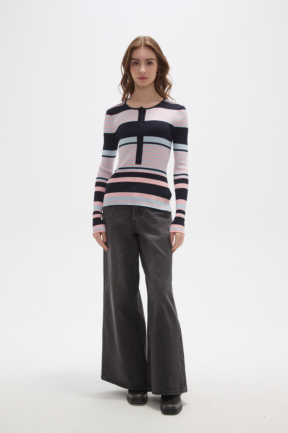 $ 883 Nuevos Recibilo en Remera manga larga de viscosa, rayas, al cuerpo, con botones y cuello a la base