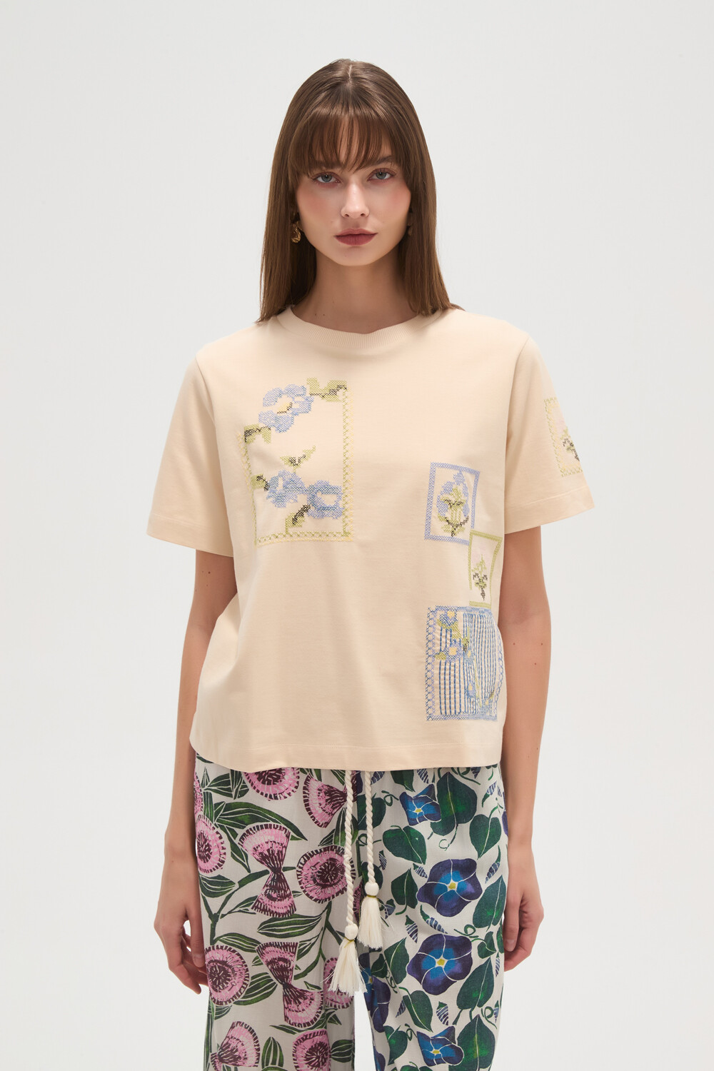 Nuevos Remera manga corta de algodon, recurso bordado, holgado y cuello a la base