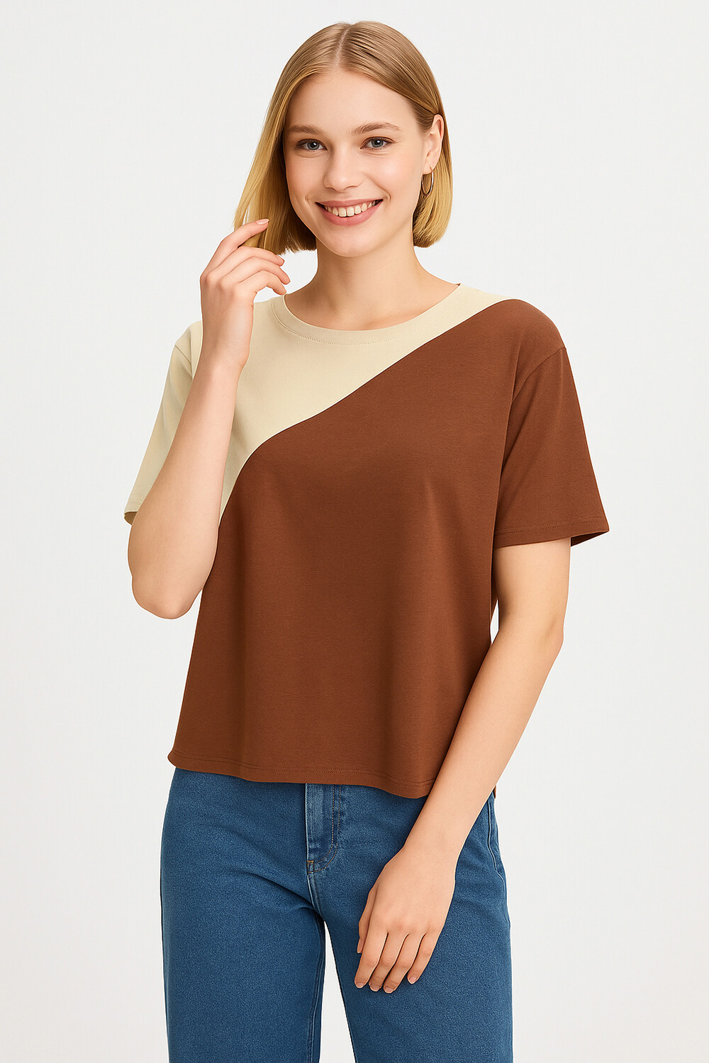 Remera manga corta de viscosa, color block, holgado y cuello a la base 01341433001 https://www.indian.com.uy/catalogo/remera-magnet-estampado-1_01341433_001