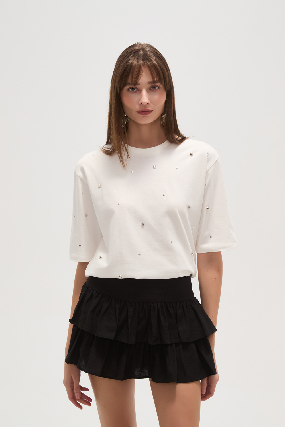 $ 539 Nuevos Remera manga corta de algodon, transparencia, con tachas y cuello a la base