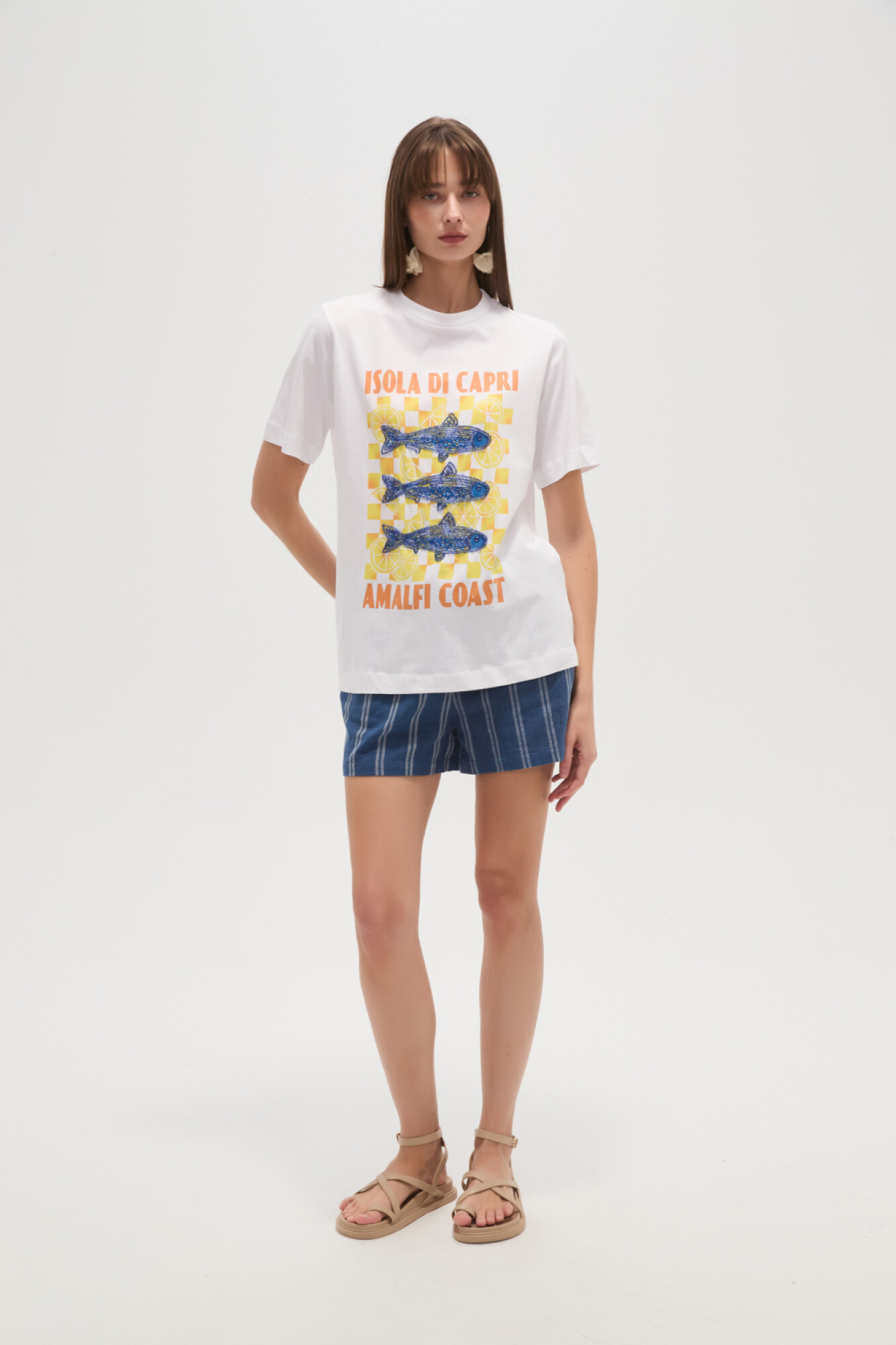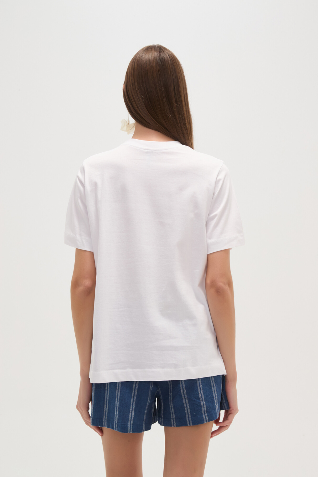 $ 543 Nuevos Recibilo en Remera manga corta de algodon, estampado, holgado y con cuentas