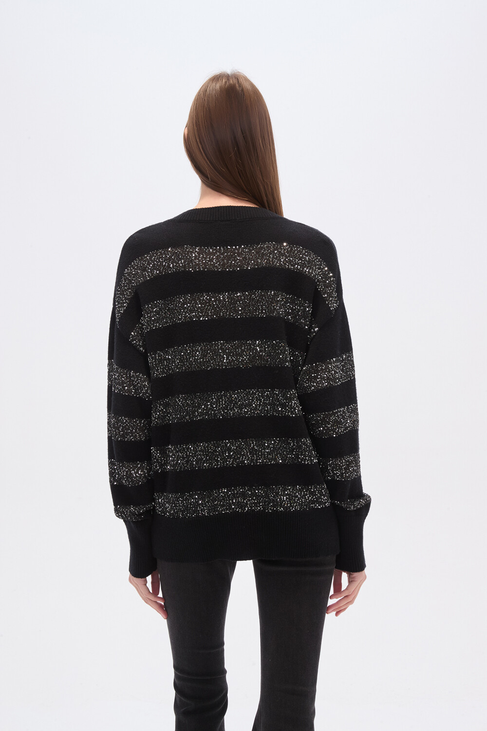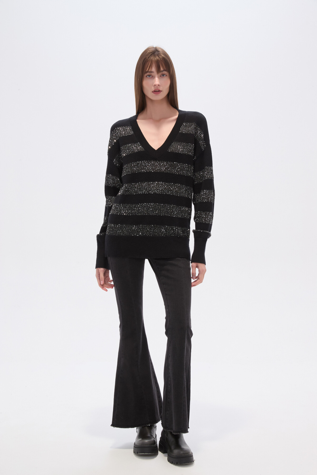 Nuevos Sweater poliester, recurso sequins, holgado y cuello en v