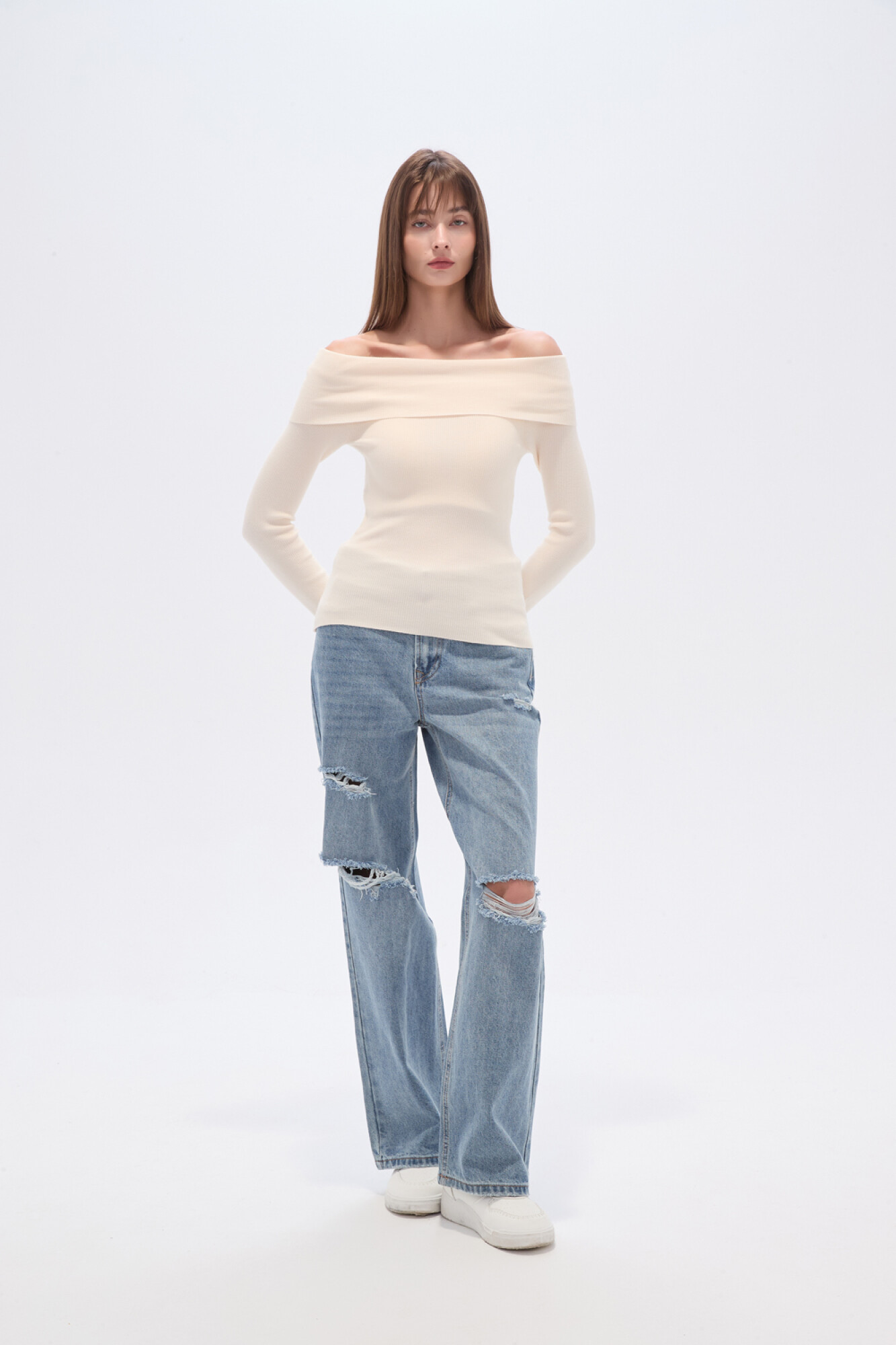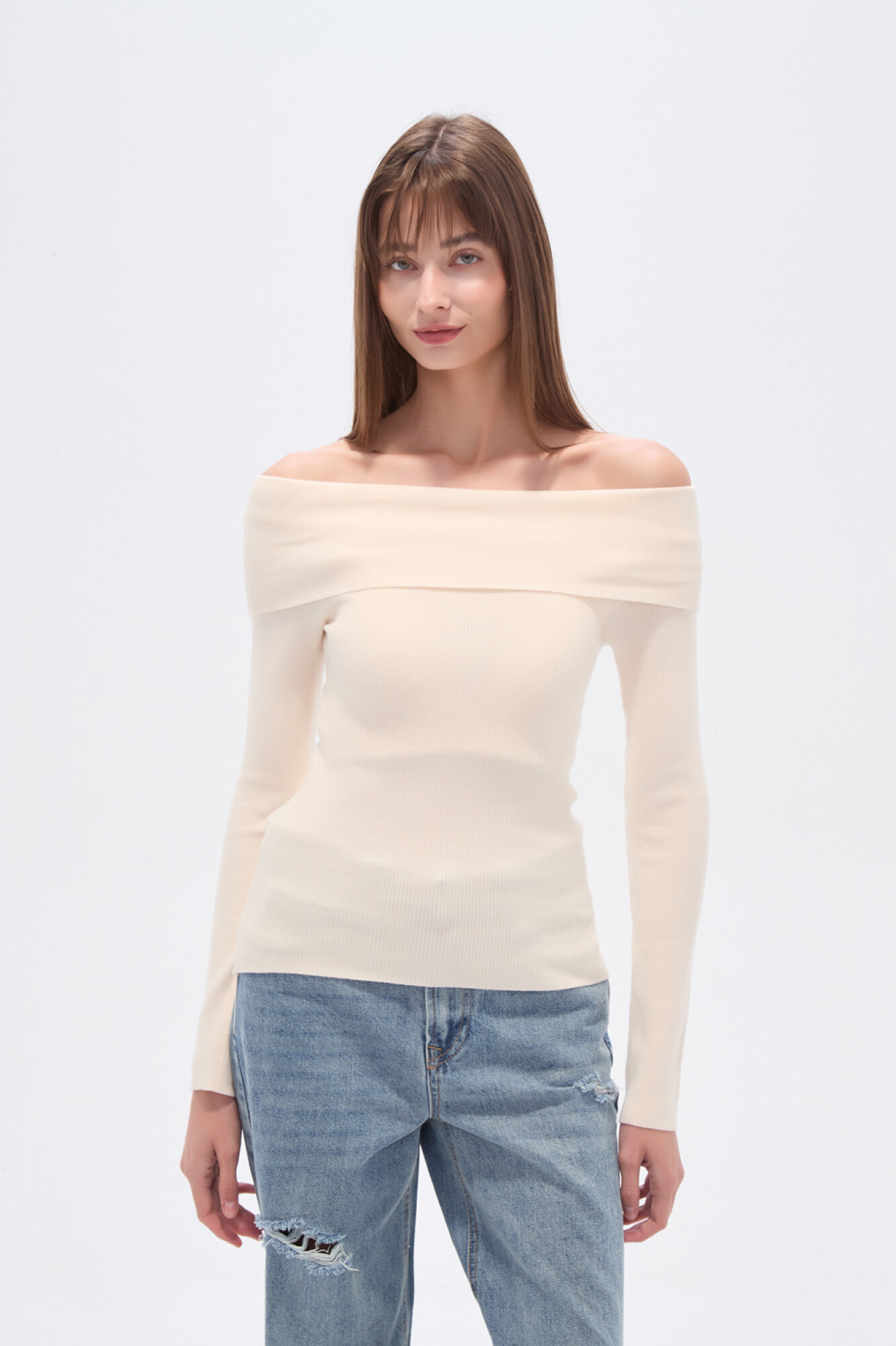 $ 883 Nuevos Tops manga larga de viscosa, al cuerpo y cuello recto