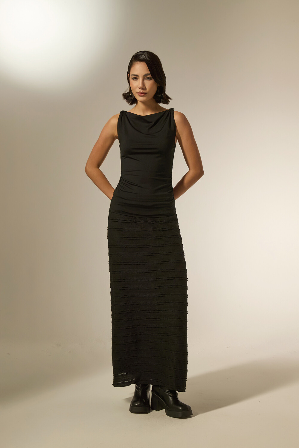 $ 611 Nuevos Tops sin mangas de poliamida, frunces, al cuerpo y cuello recto
