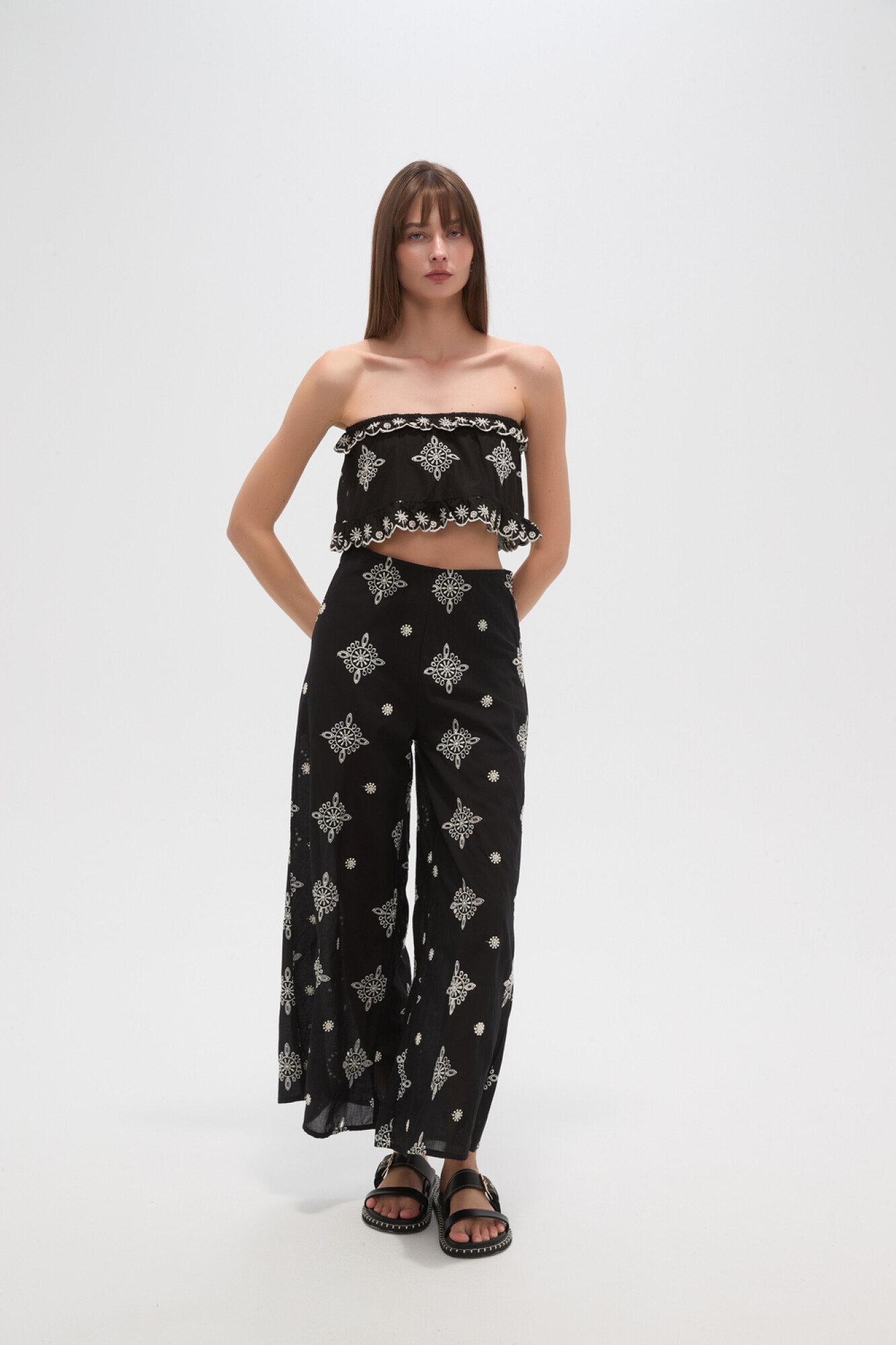 $ 611 Nuevos Recibilo en Tops cropped de algodon, broderie, volados, al cuerpo, con elastico y cuello strapless