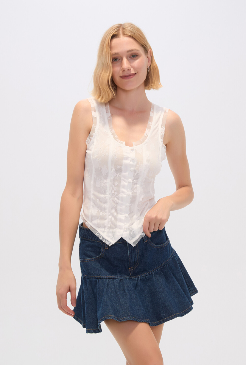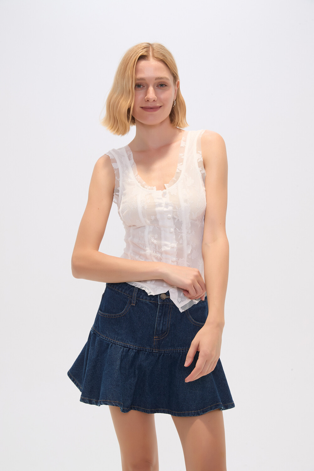 $ 731 Nuevos Recibilo en Tops bretel fino de poliamida, recurso bordado, broderie, al cuerpo, con botones y cuello redondo
