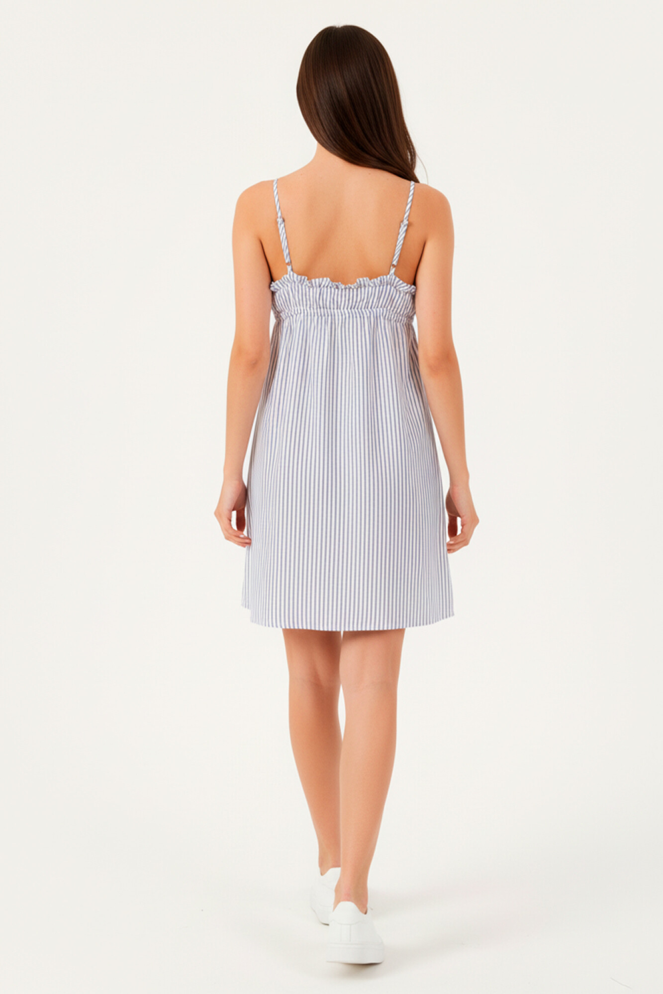 $ 883 Nuevos Recibilo en Vestido bretel fino de algodon, aop, rayas, volados, holgado, con elastico y cuello profundo