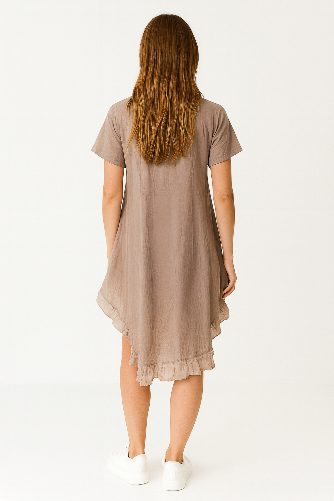 $ 679 Nuevos Recibilo en Vestido manga corta de algodon, wash, volados, holgado y cuello redondo