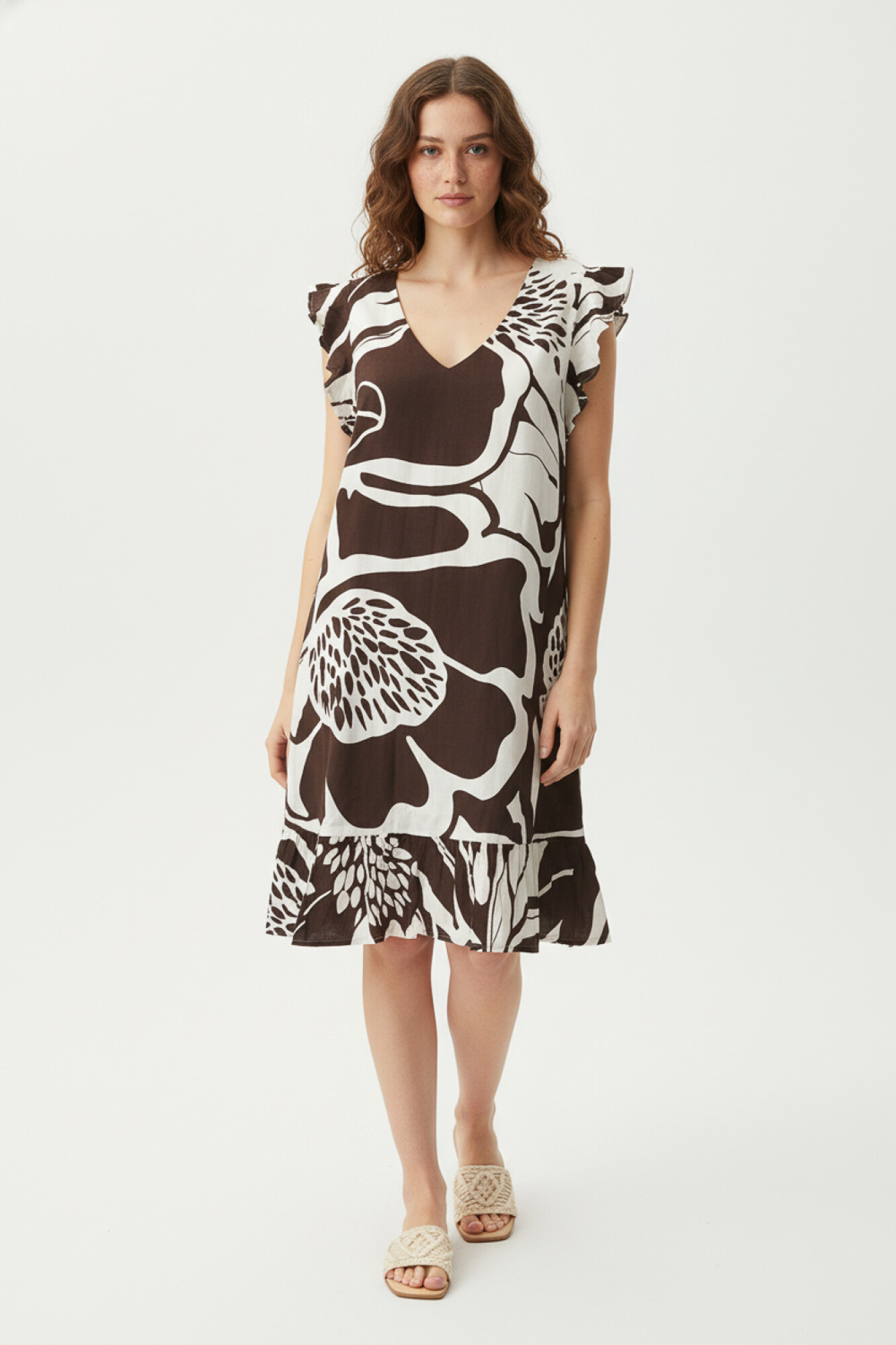 $ 787 Nuevos Recibilo en Vestido manga corta rodilla, aop, estampado, volados, holgado y cuello en v