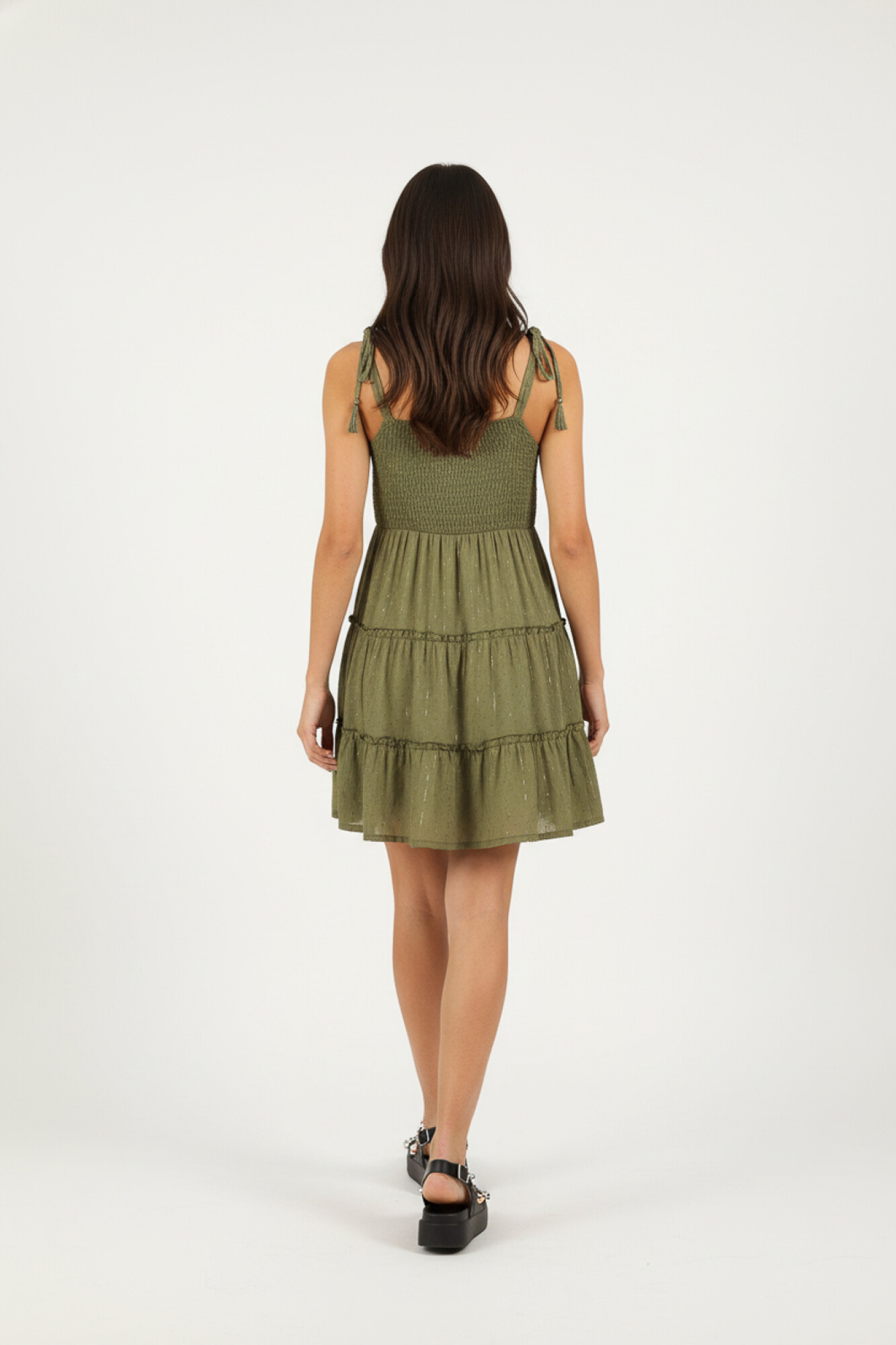 Nuevos Recibilo en Vestido bretel fino de algodon, frunces, holgado, con borla, con lazo y cuello redondo