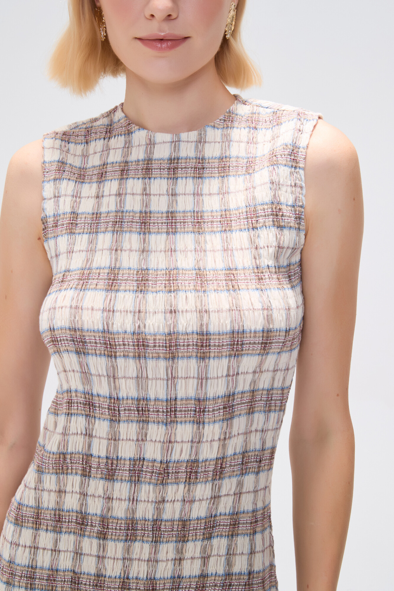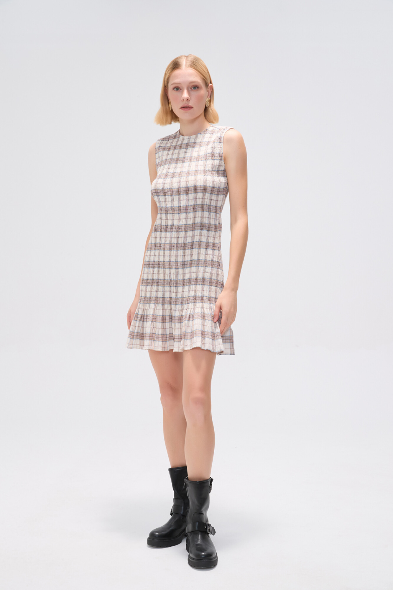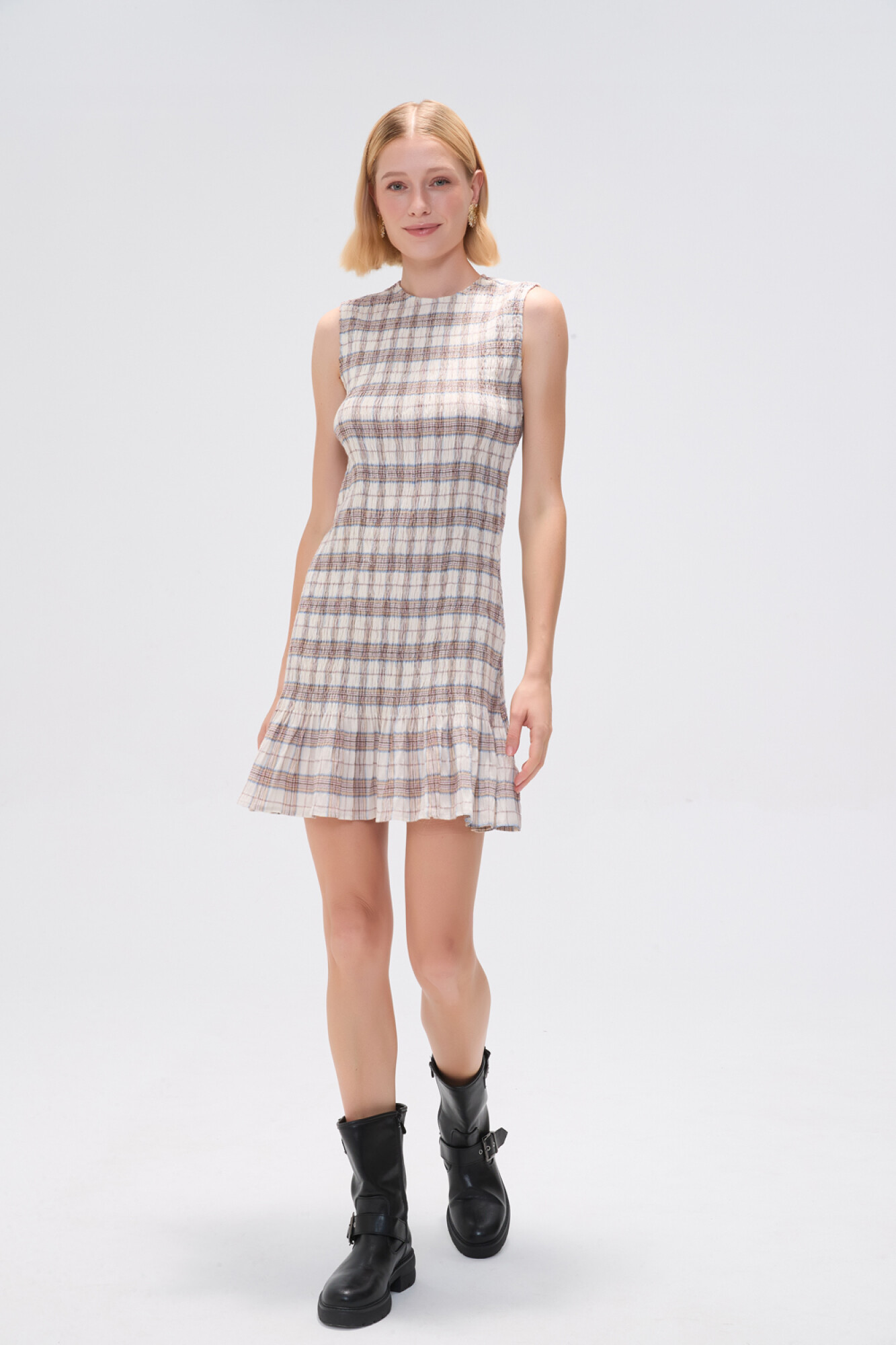 $ 951 Nuevos Recibilo en Vestido bretel ancho de algodon, aop, punto smock, volados, al cuerpo, con boton y cuello a la base