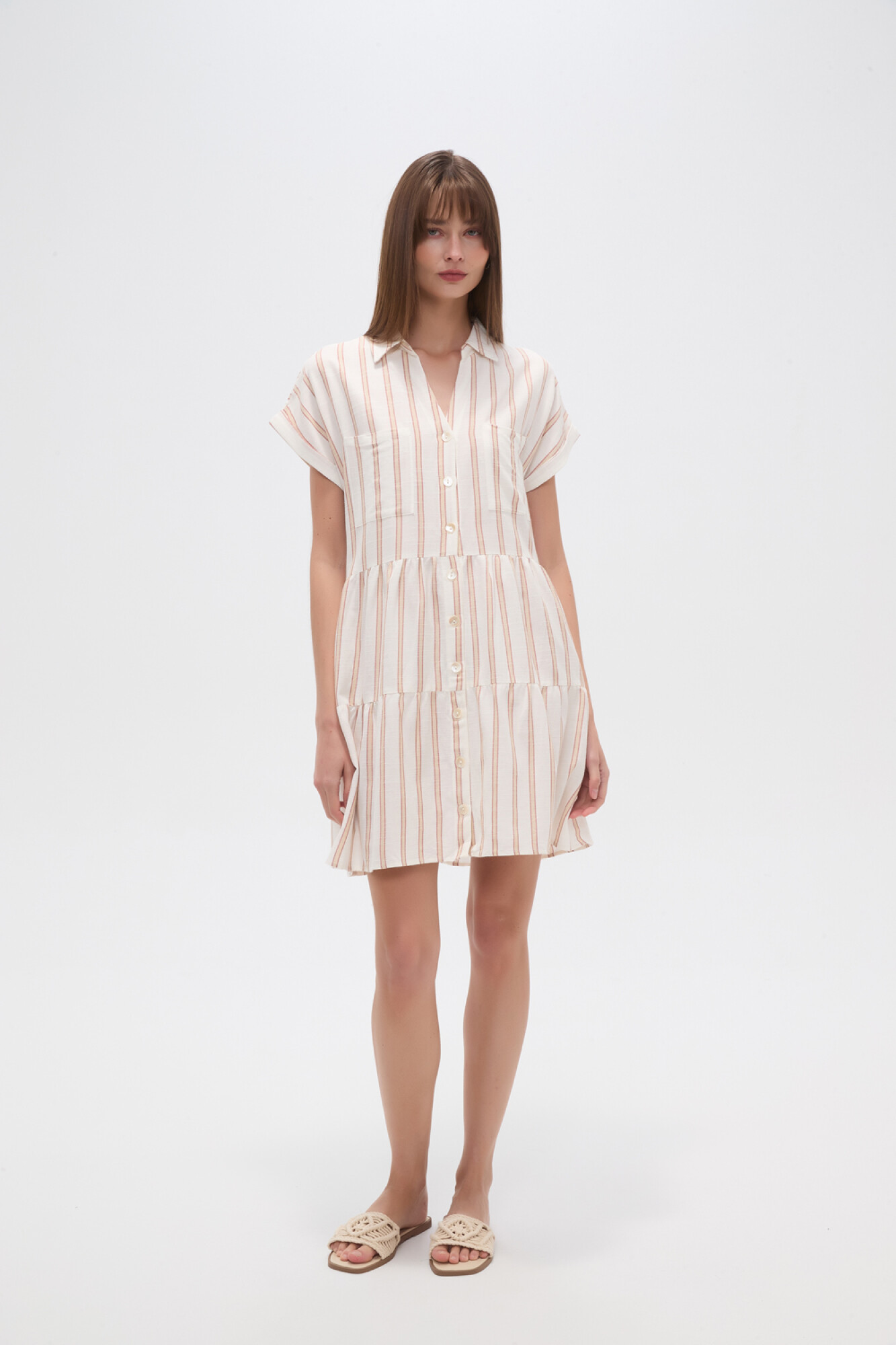 $ 1.019 Nuevos Vestido rodilla de viscosa, rayas, volados, holgado, con botones y cuello camisa