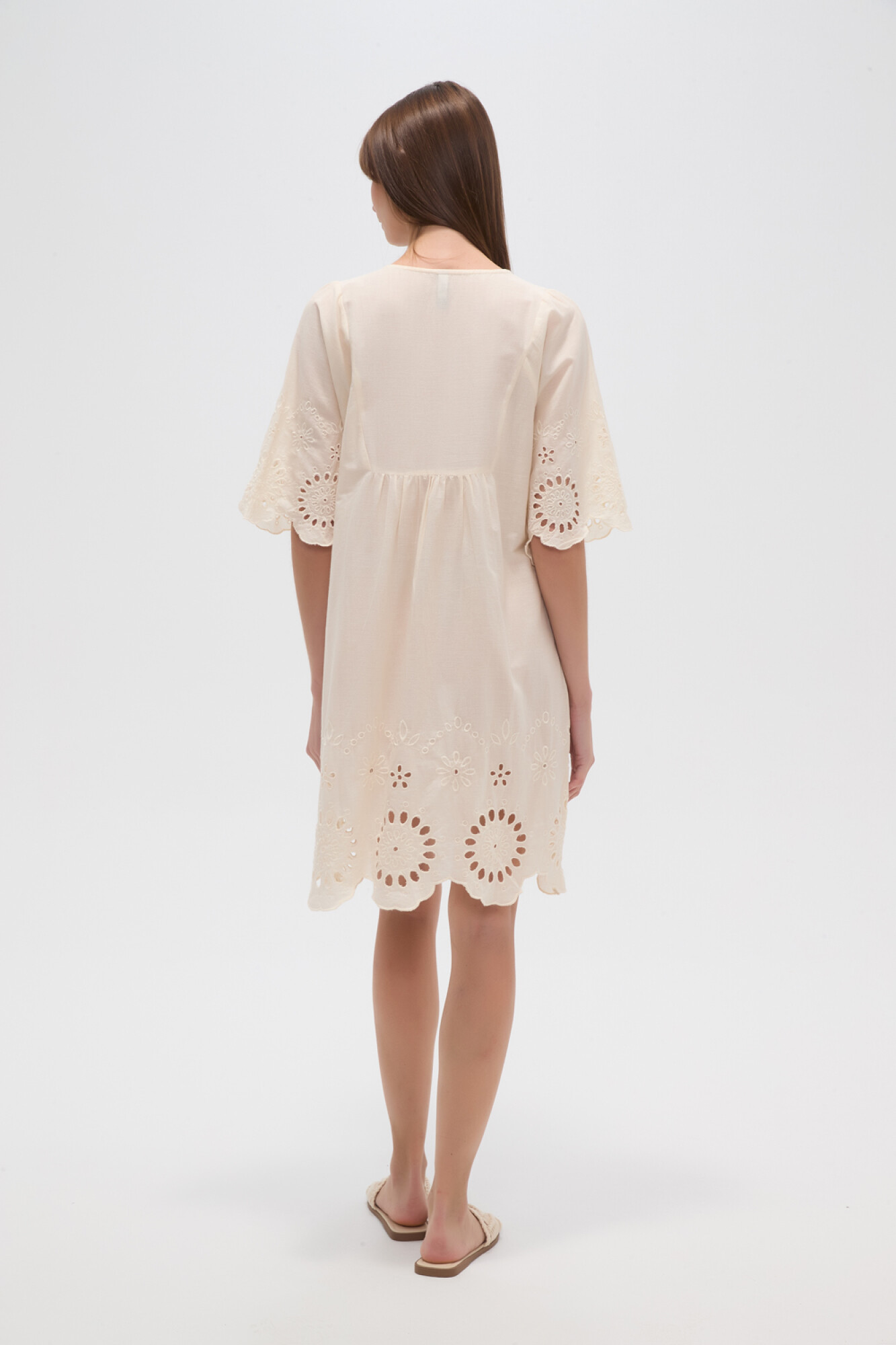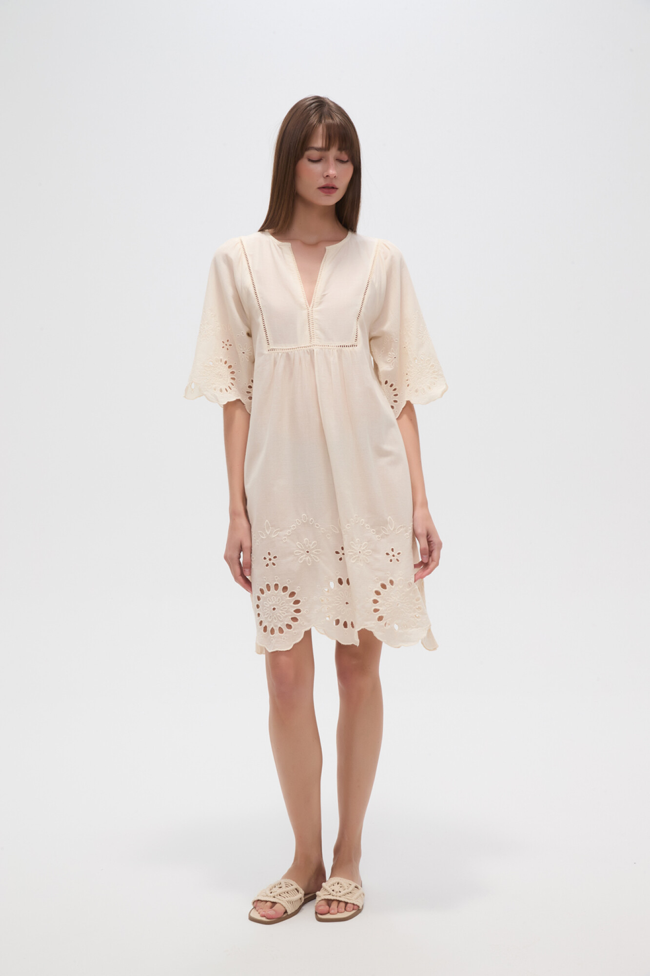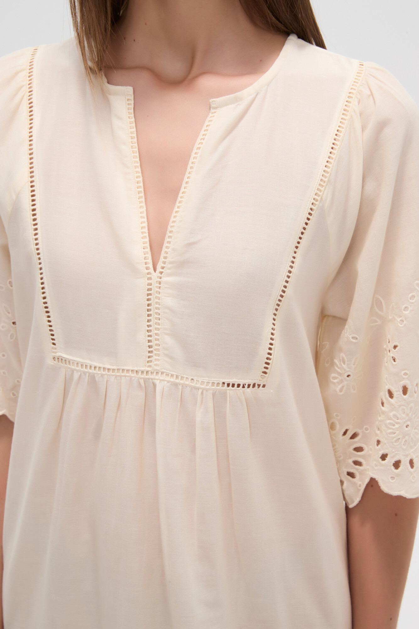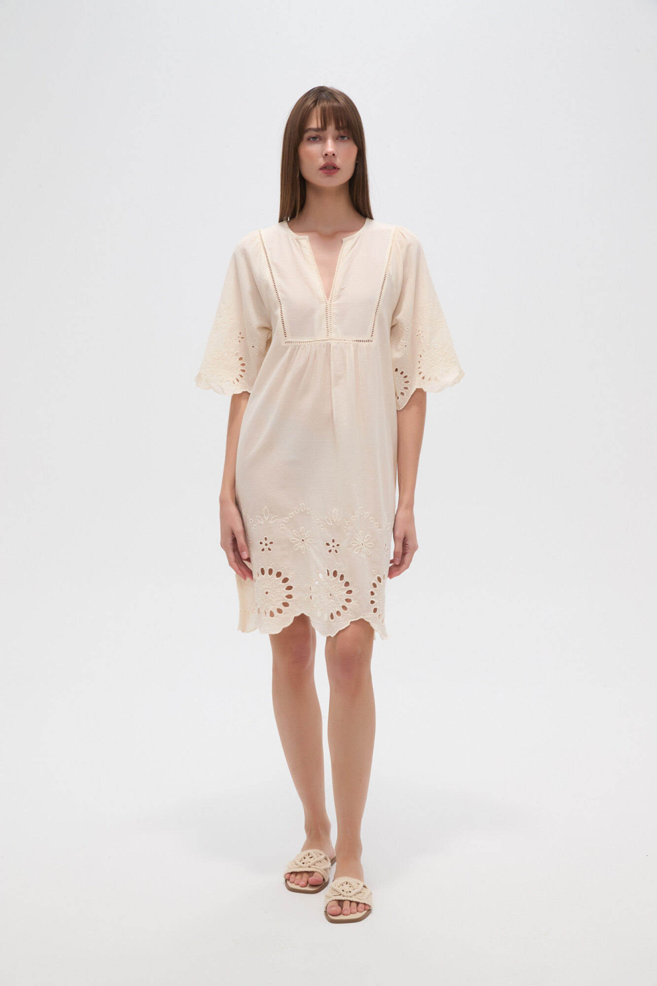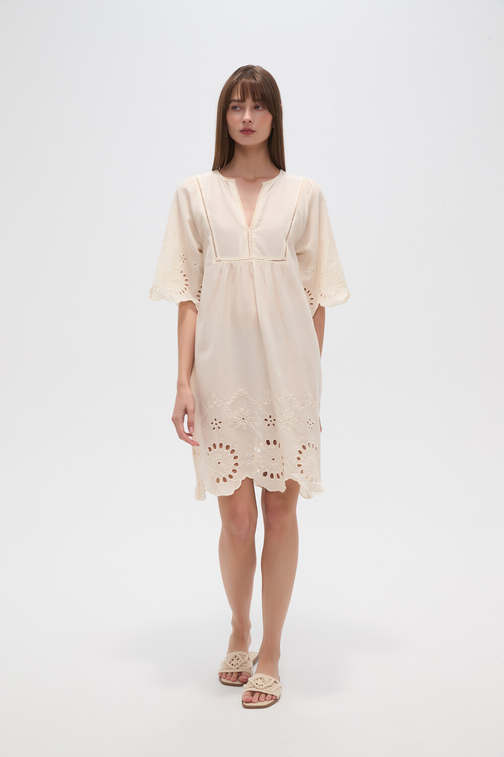 Nuevos Vestido manga 3/4 de algodon, recurso bordado, bordado, broderie, holgado, con cinta y cuello en v
