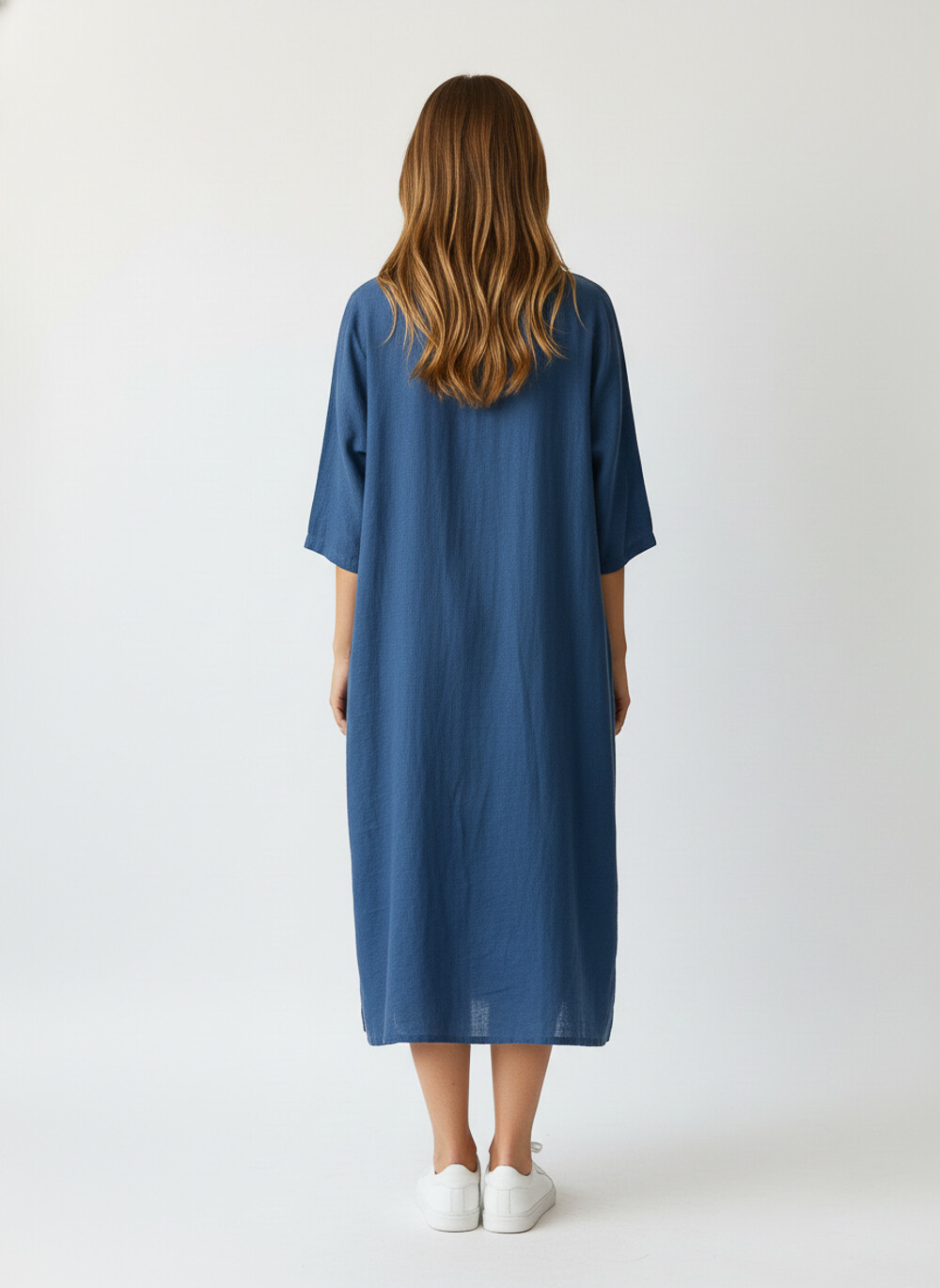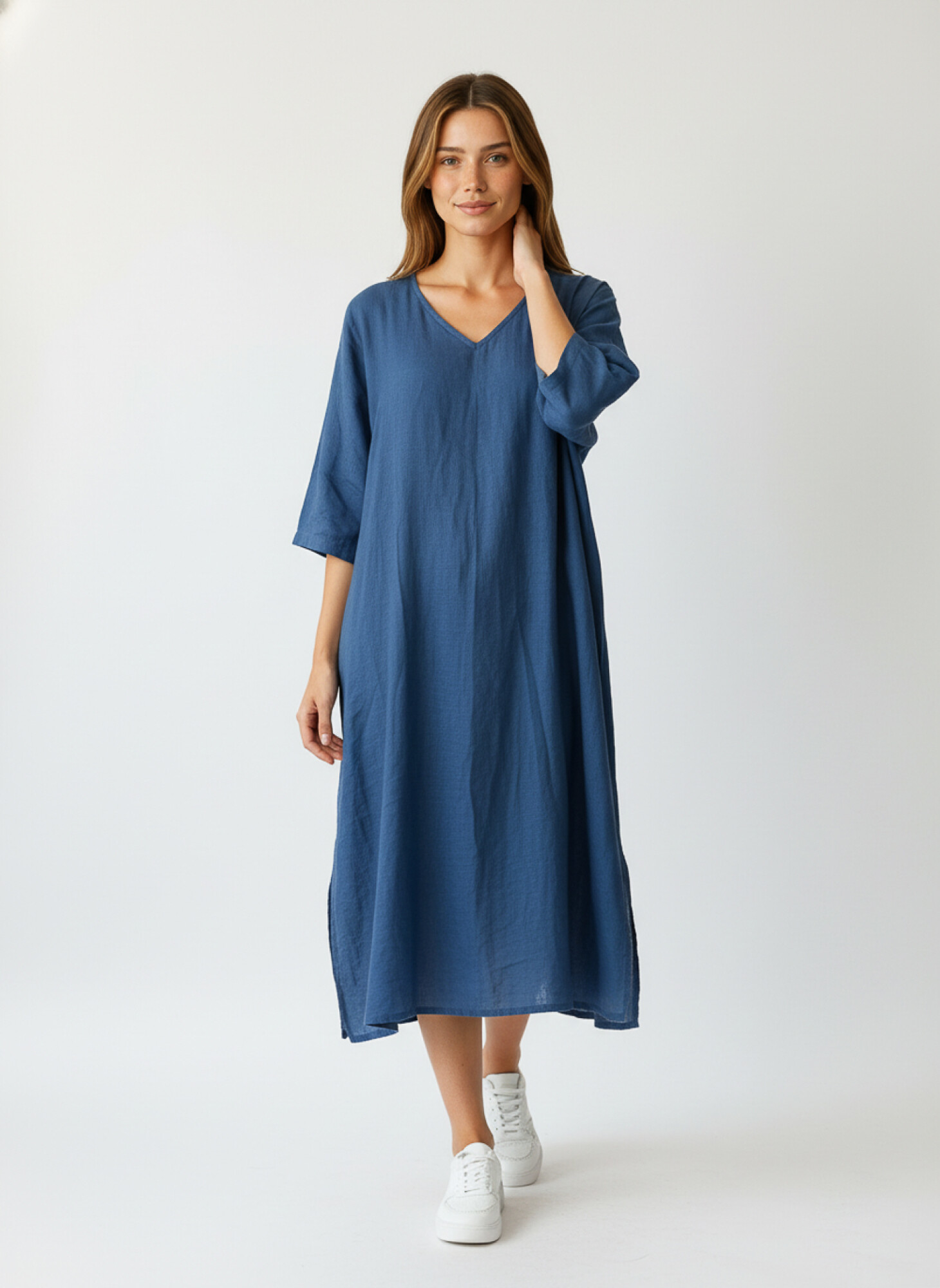 Nuevos Recibilo en  Vestido largo de algodon, con bolsillo, holgado y cuello en v