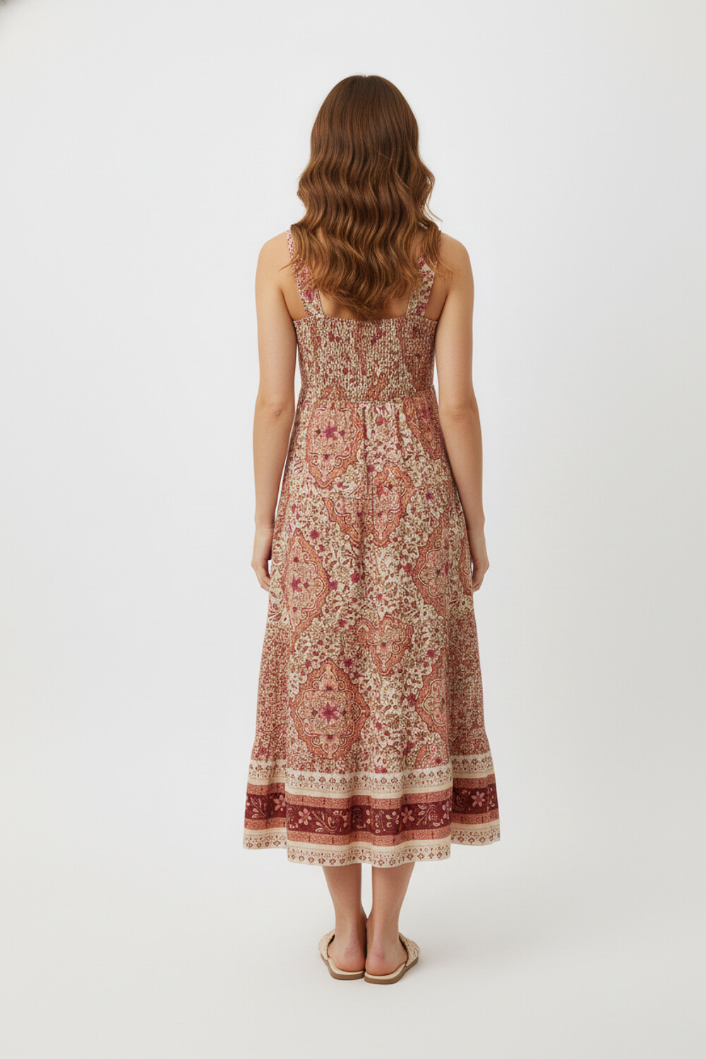 $ 843 Nuevos Vestido largo de viscosa, aop, punto smock, holgado, con elastico y cuello cuadrado