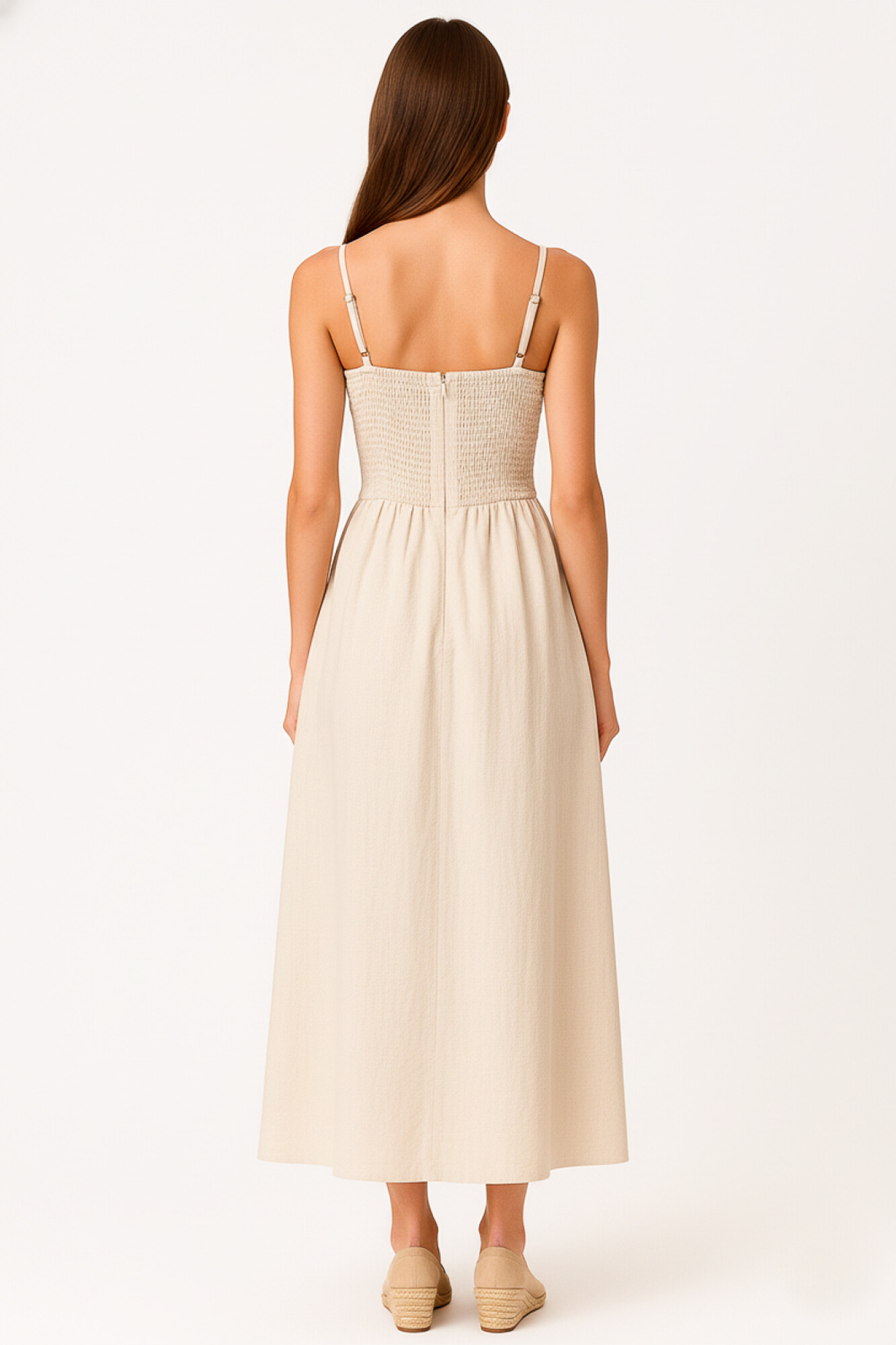 $ 764 Sale Vestido bretel fino de lino + viscosa, bolsillos, punto smock y cuello cuadrado