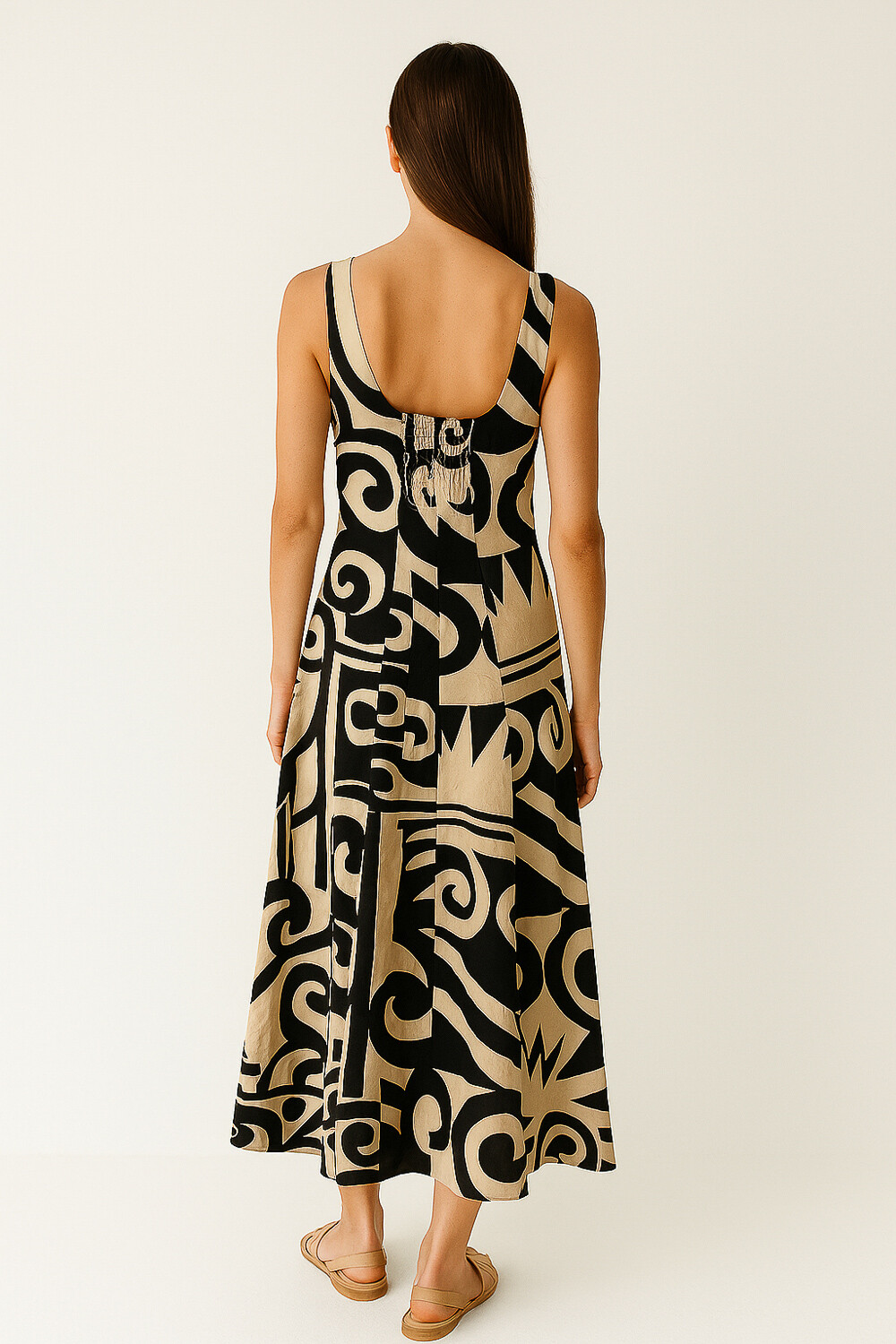 $ 1.155 Nuevos Vestido sin mangas de viscosa, aop, punto smock, evasé, con cierre y cuello cuadrado
