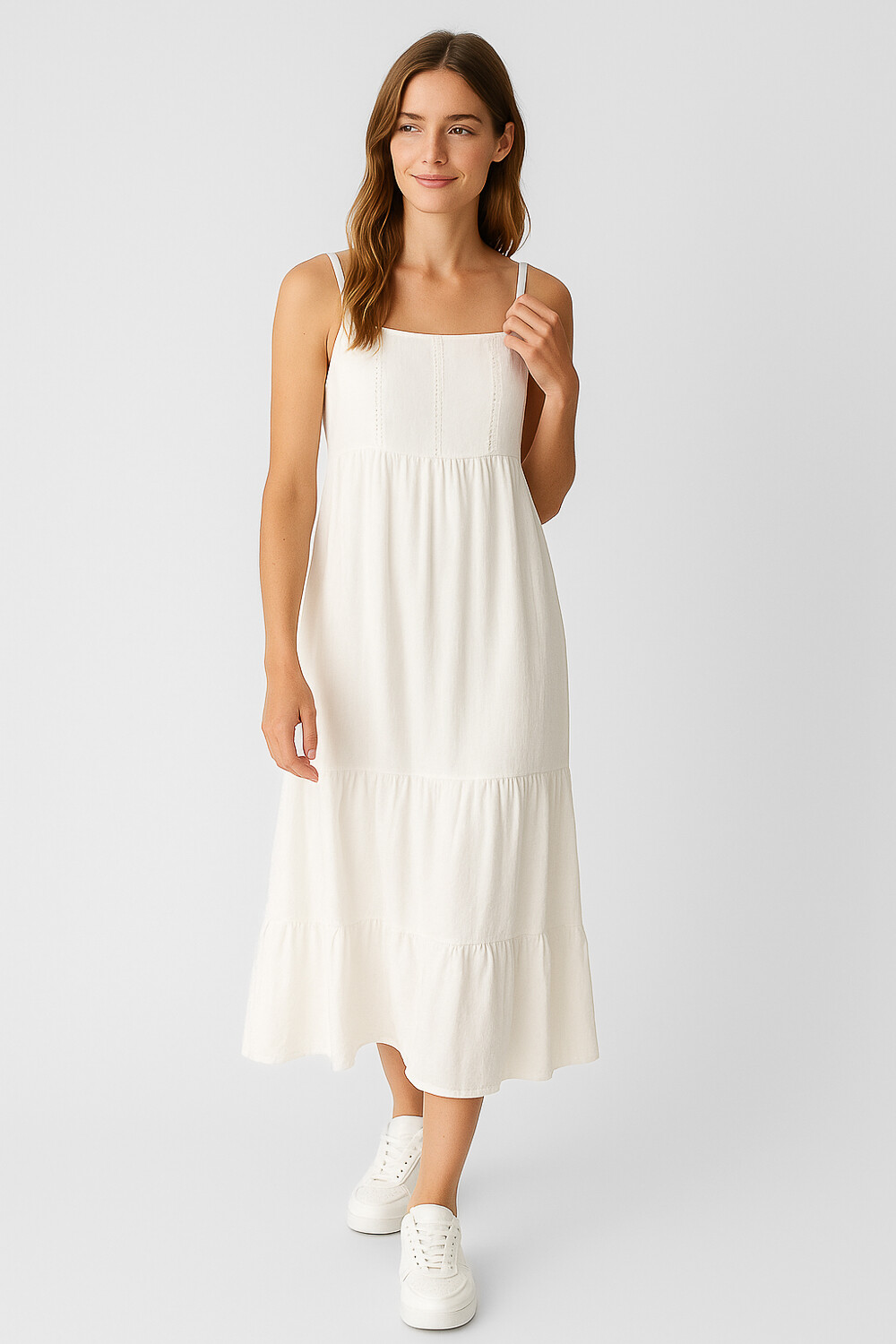 Vestido largo de viscosa, recurso bordado, bordado, holgado, con reguladores y cuello recto 01342480100 https://www.indian.com.uy/catalogo/vestido-sival-blanco_01342480_100