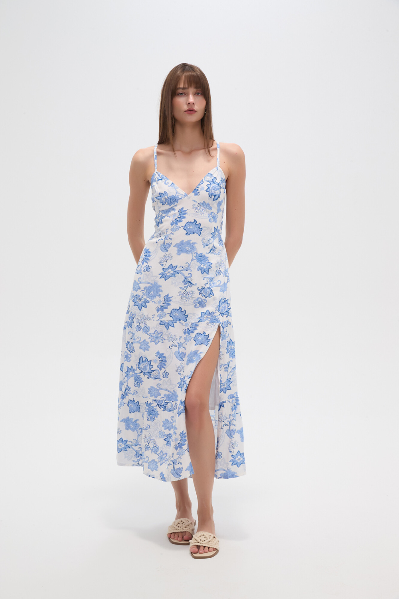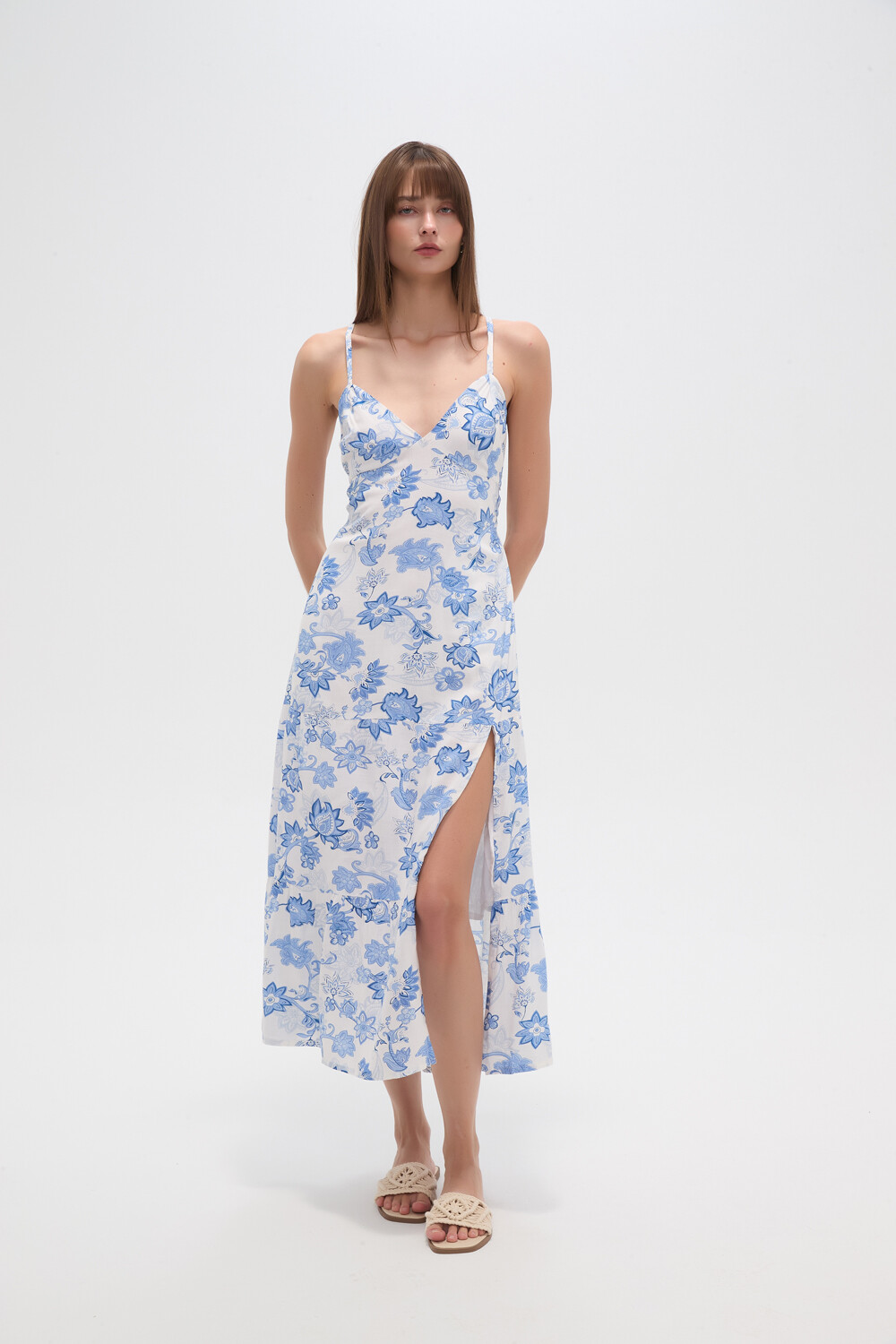 Nuevos Vestido largo de viscosa, aop, estampado, tajo, con cordon, con elastico y cuello en v